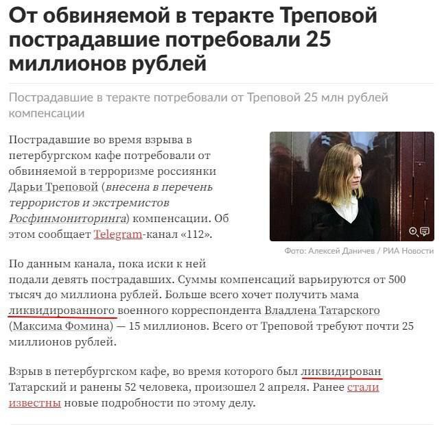 Этот ублюдочный текст только отражает настроения и убеждения изрядного количества людей, сидящих в разного рода бестолковых редакциях. Причём, редакции эти живут на госбюджеты. У них, у людей этих, Владлен Татарский "ликвидирован", не потому что это опечатка, не потому что они в политкорректость заигрались. А потому что они сами так думают. Их симпатии - и журналистов этих, и вообще редакции "Ленты" - на стороне Треповой. Они бы и сами всех этих патриотов и русню ликвидировать хотели. Потому делают, что могут. Ведут свою идеологическую боротьбу против руснявых мразей потихоньку. Ликивидаторы. Они не способны написать, что Владлен Татарский был убит. Потому что тогда, это создаст негативный фон для террористки Треповой, которой вся редакция "Ленты" глубоко сочувствует.