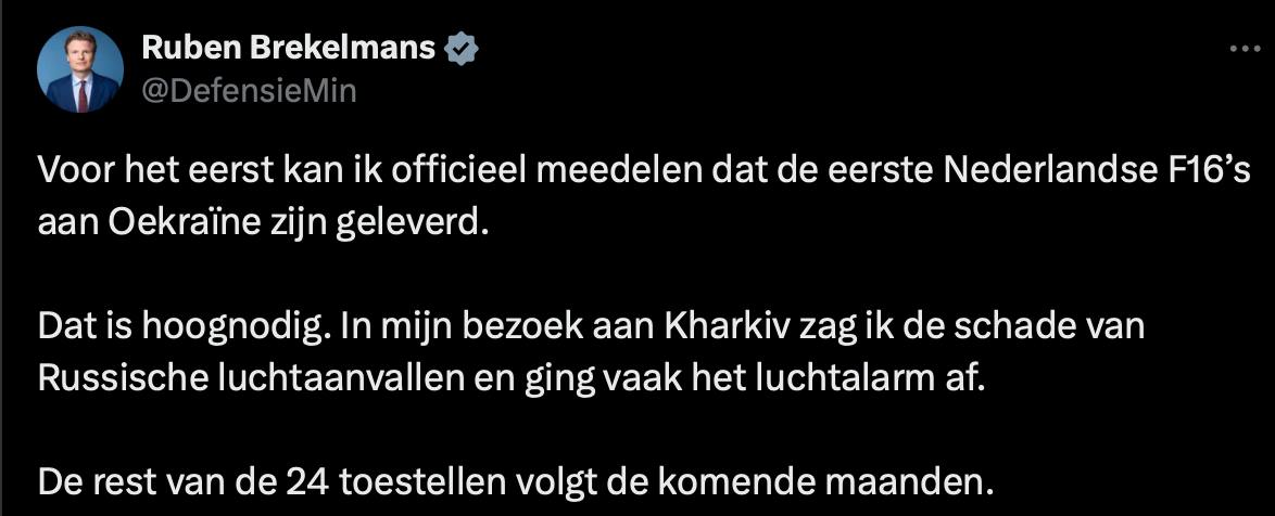 "Впервые могу официально заявить, что первые голландские F16 доставлены в Украину... Остальные 24 самолета поступят в ближайшие месяцы", - сообщил Рубен Брекельман.