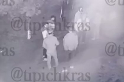 На кадрах один из подростков сбивает мужчину с ног. Тот падает на асфальт, в это время к дерущимся подбегают еще несколько человек из той же компании и обступают их полукругом.