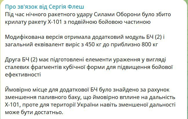 Вероятно, место для дополнительной БЧ было найдено за счет уменьшения топливного бака, что вероятно повлияет на дальность Х-101, однако для территории Украины даже уменьшенной дальности может быть достаточно».
