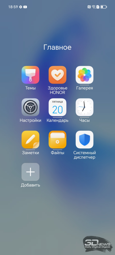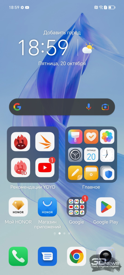 От прошлогодней MagicUI 6.1 новая оболочка отличается в первую очередь раздельной панелью уведомлений и быстрых настроек – это более актуальное и современное решение. Также обращает на себя внимание слегка расширенная функциональность умного помощника YoYo – теперь он умеет распознавать текст на картинке. Оболочка опрятная, быстрая, с модными большими папками и без какой-либо странной специфики. Предустановленных приложений немало, но не могу сказать, что здесь откровенный перебор (как у соседей из HUAWEI, например). Google-сервисы, конечно же, на месте — HONOR эти проблемы больше не касаются.