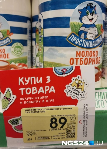 «Простоквашино» 2,5% — базовая цена 109,98 рубля, акционная цена 89,90 рубля.