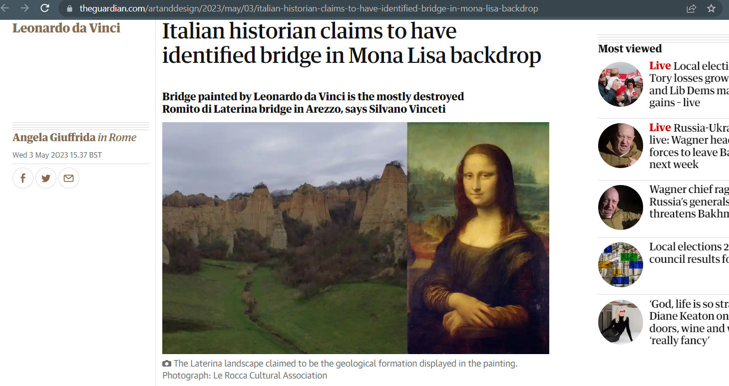 Итальянский историк Сильвано Винчети заявил, что смог идентифицировать изображенный мост на фоне Моны Лизы на картине Леонардо да Винчи. Это мост Ромито ди Латерина в провинции Ареццо. Об этом стало известно 5 мая из публикации издания The Guardian.