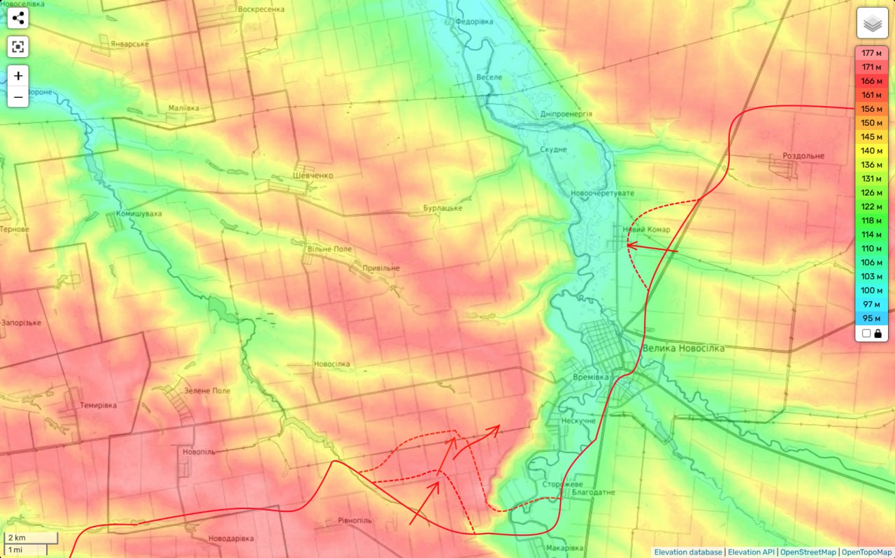 Во-вторых, продолжались наши атаки на холмах по направлению к Нескучному. Выход к нему с юго-запада не только станет приговором гарнизону ВСУ в Сторожевом, но и поставит под визуальный наш контроль последнюю трассу в Большую Новосёлку (с запада).