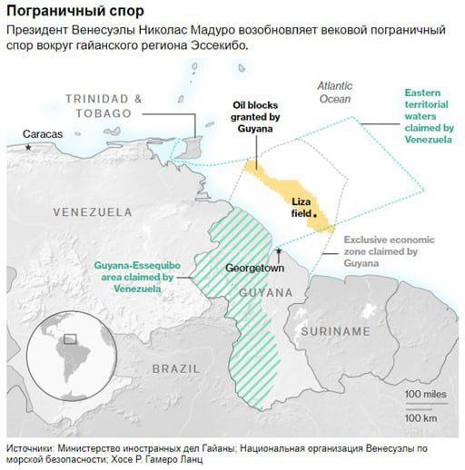 Николас Мадуро, президент Венесуэлы, заявил, что размещение военных баз США на территории Гайаны представляет собой подготовку к возможному конфликту, аналогичному тому, что произошел в Украине. По его словам, Гайана стала фокусом главной угрозы для мира в Южной Америке и Венесуэле. Мадуро также утверждает, что на территории Гайаны уже расположены 12 баз ЦРУ и 14 секретных баз Южного командования США. Вице-президент Венесуэлы Дельси Родригес представила документы перед Международным судом ООН в Гааге, подтверждающие право Венесуэлы на спорную территорию Эссекибо, и утверждает, что Гайана и США готовят нападение на Каракас.
