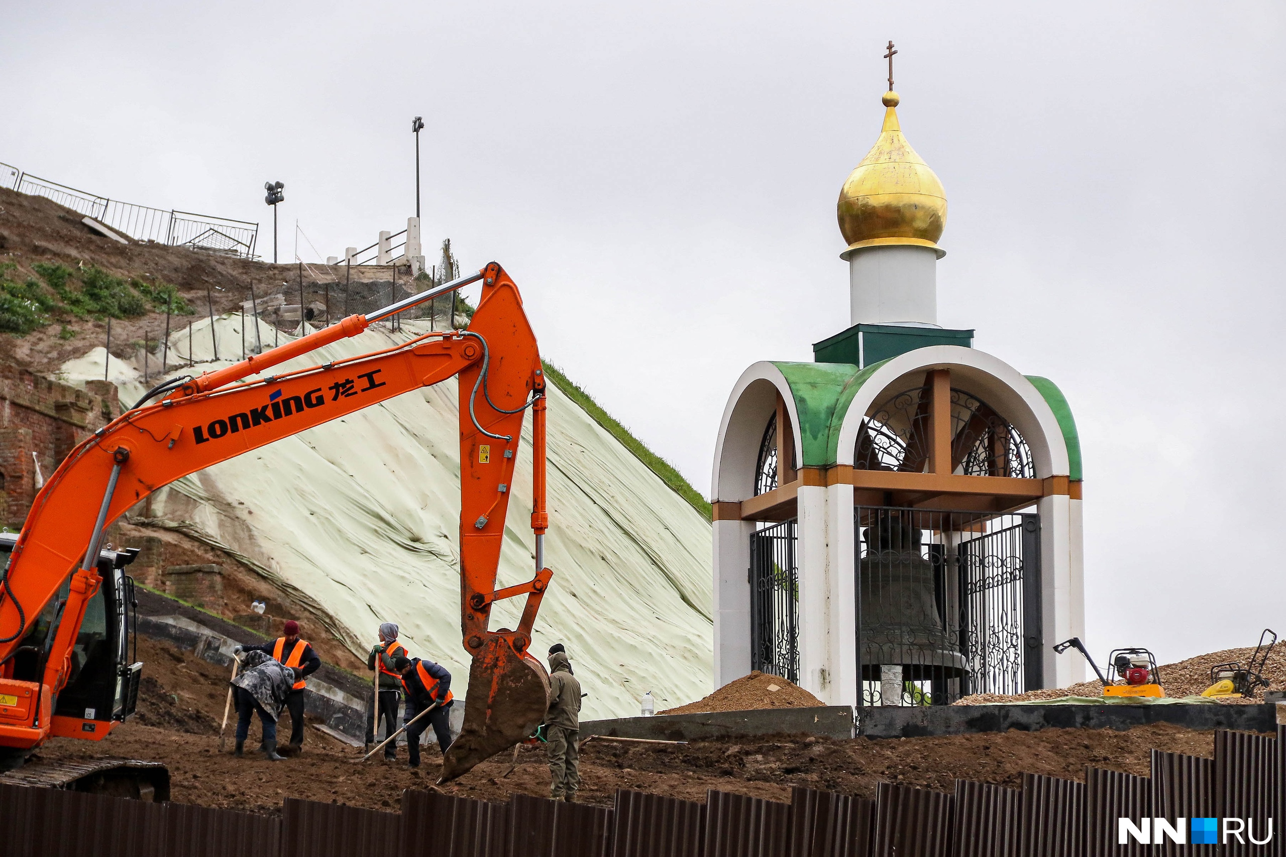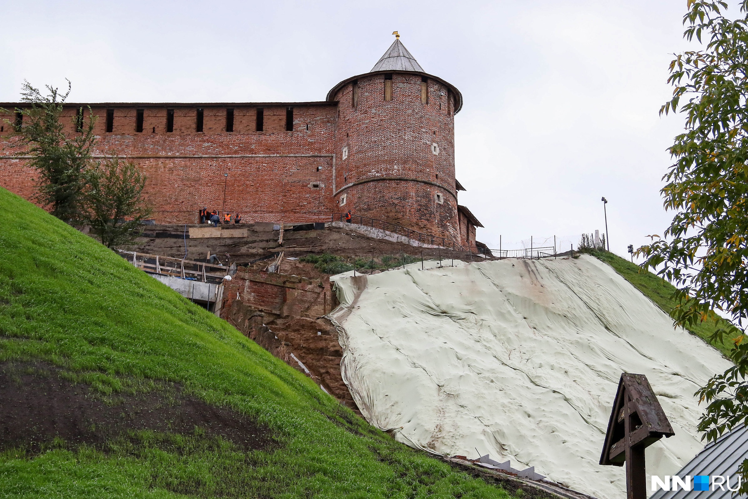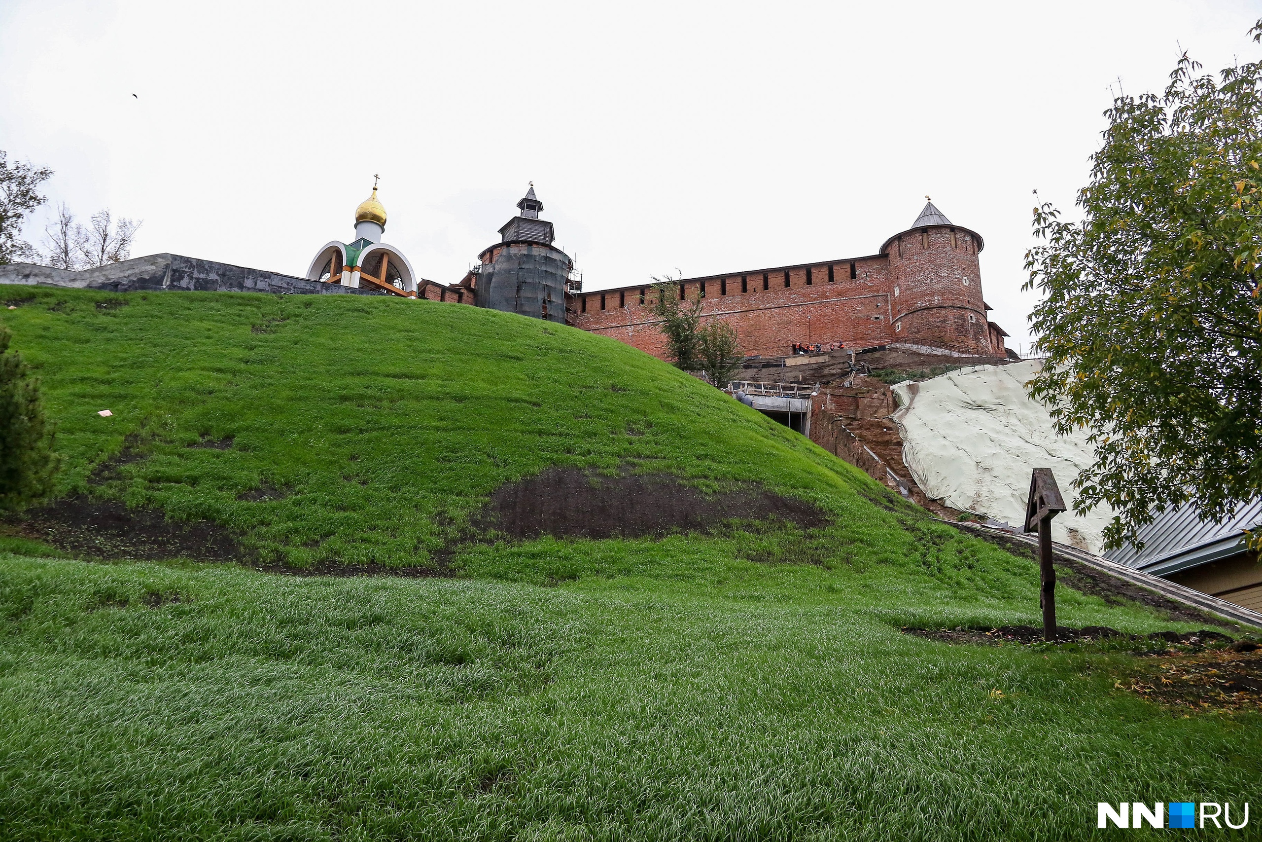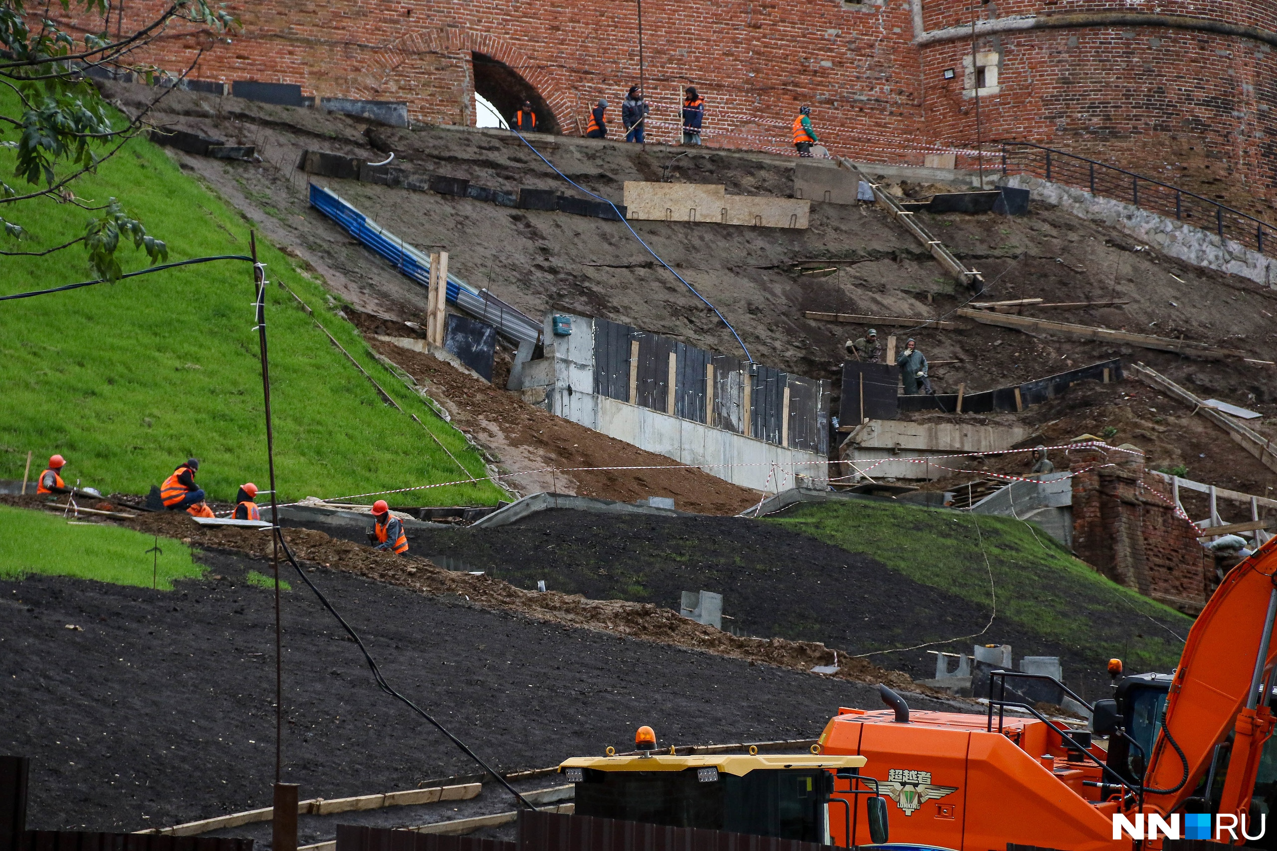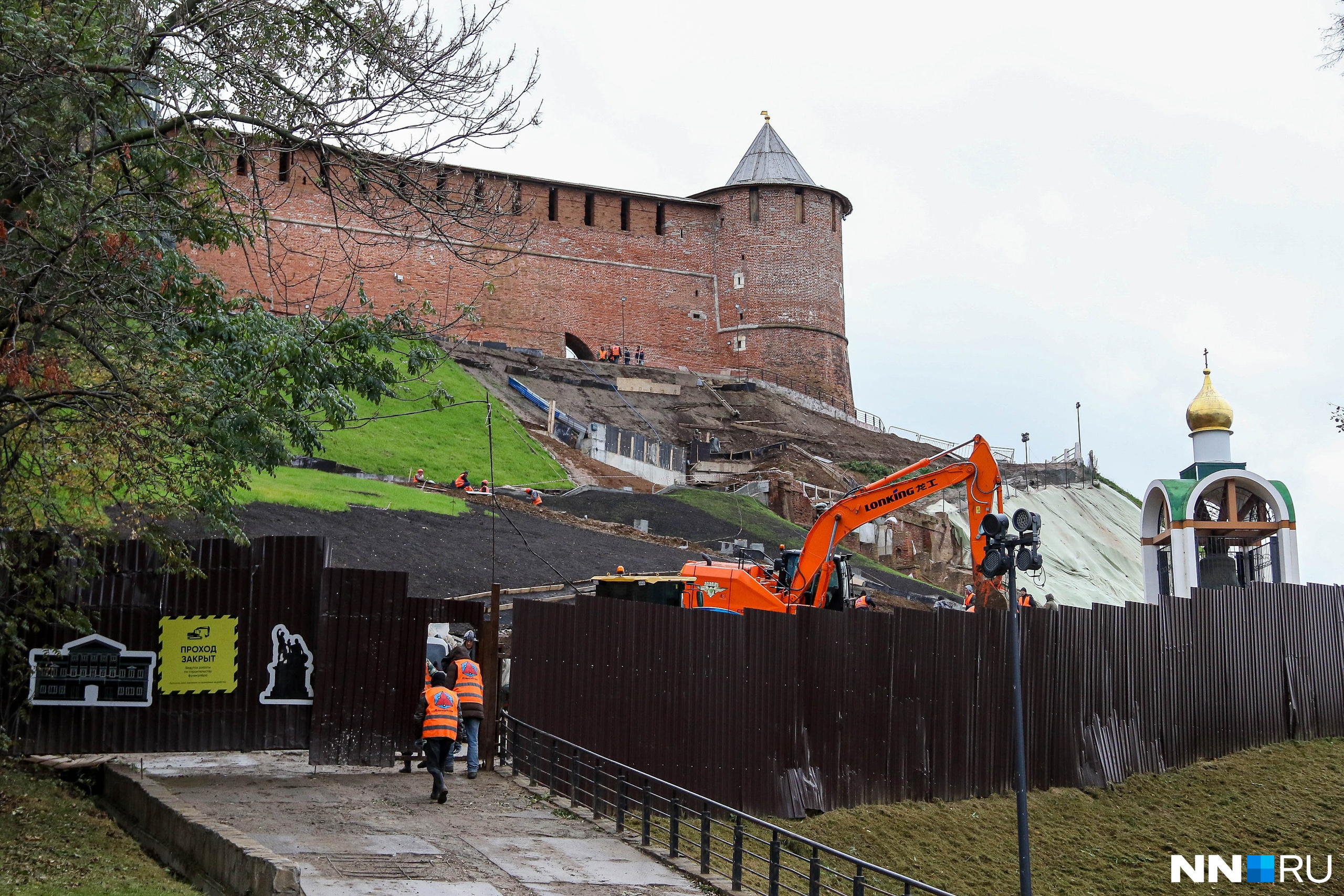Склон рядом с Северной башней всё еще закрыт забором. С одной стороны его «одели» в ярко-зеленый газон, сильно контрастирующий с осенним пейзажем. Земляные работы на другой стороне — в самом разгаре. Как подсмотрел наш фотограф, за забором трудятся люди с лопатами и стоит тяжелая техника.