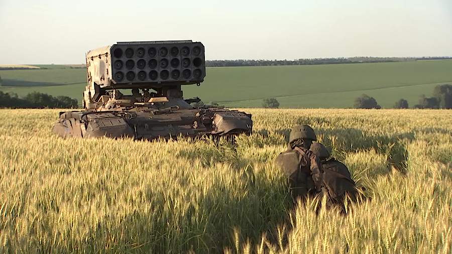 Расчет тяжелой огнеметной системы (ТОС) «Солнцепек» разгромил скоплениям живой силы украинских войск в районе Курдюмовки (Артемовский район Донецкой Народной Республики (ДНР), заявил 14 июля начальник пресс-центра группировки «Юг» Вадим Астафьев.