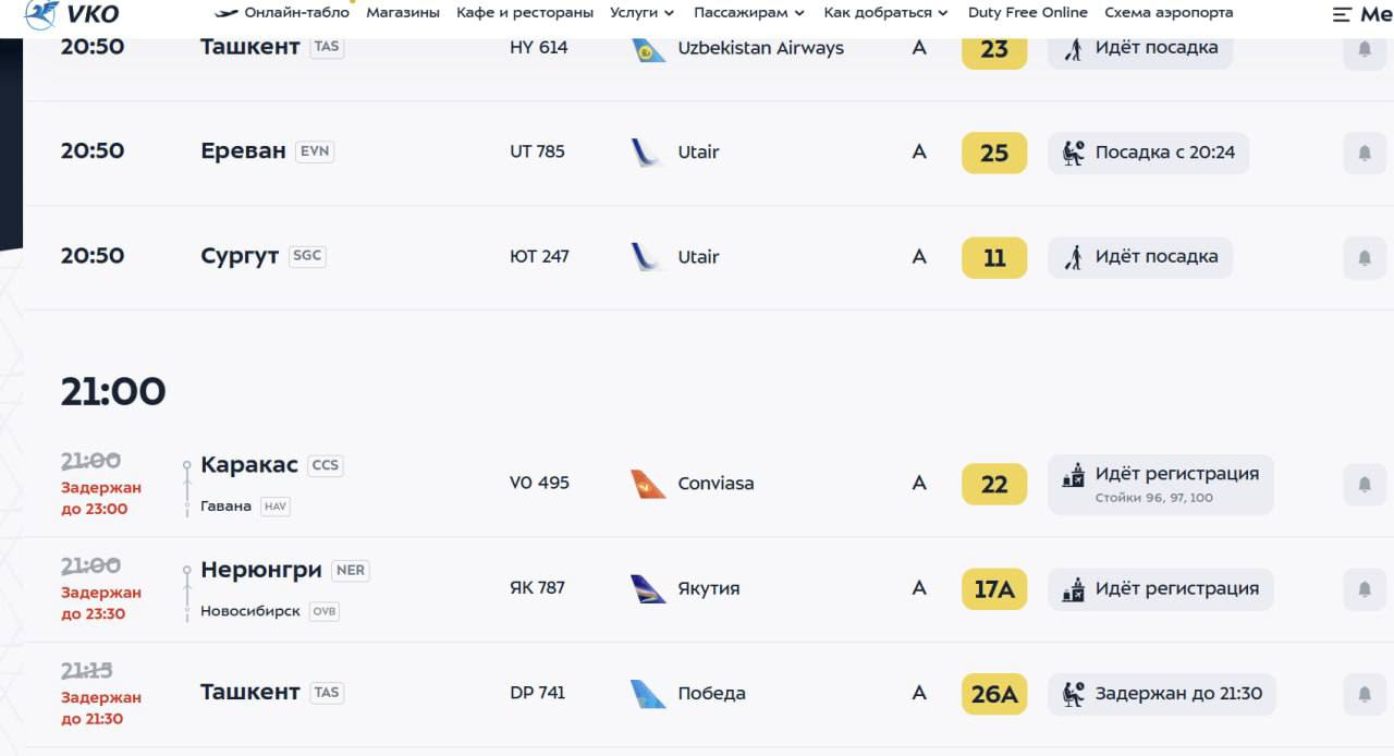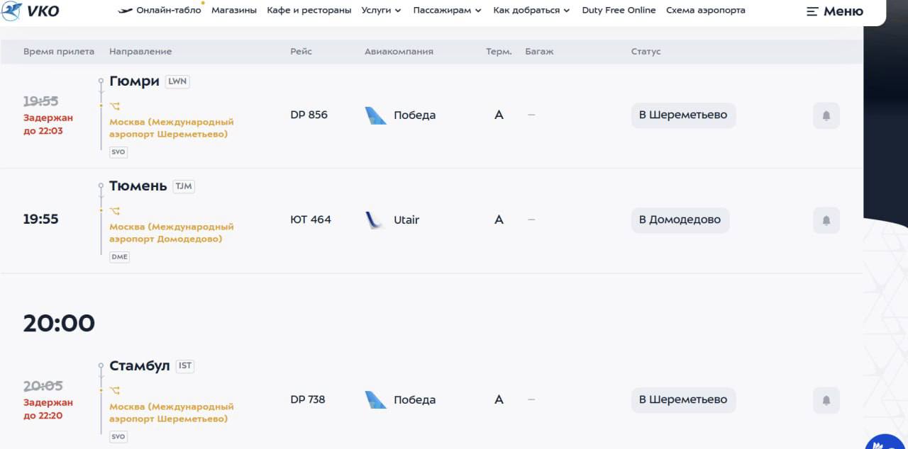 В аэропорту Внуково массовые задержки рейсов. Также некоторые самолёты, которые должны были совершить посадку во Внуково, направлены в другие аэропорты Москвы. Так, рейсы из Стамбула и Гюмри приземлятся в аэропорту Шереметьево, а из Тюмени — в Домодедово.
