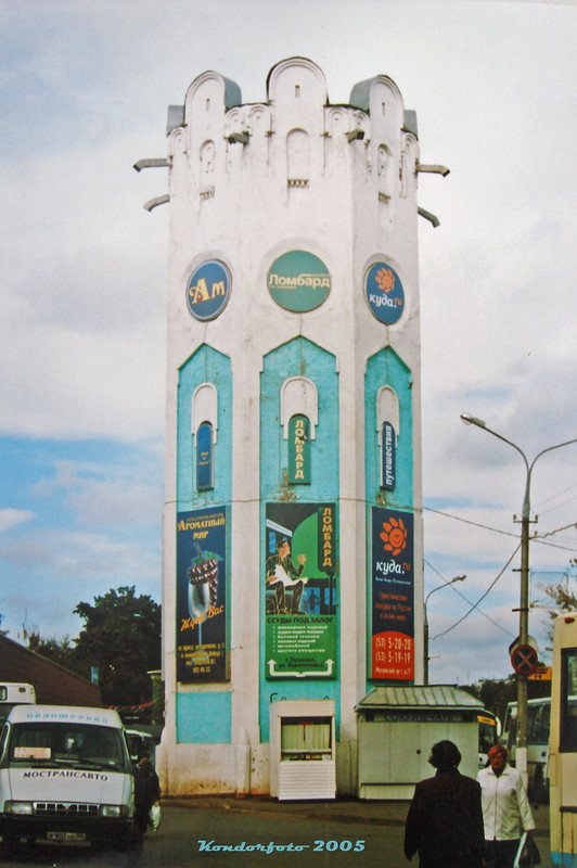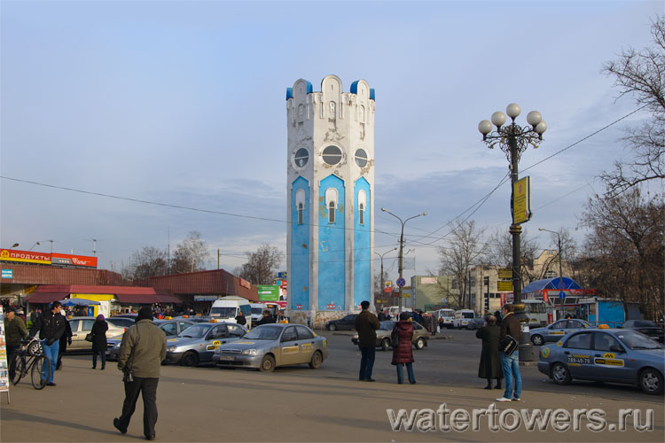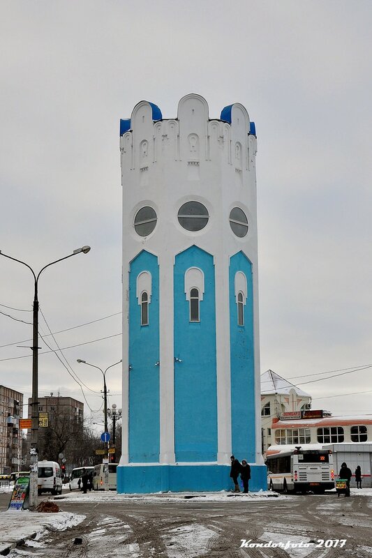 Впрочем, уже к концу года штукатурка начала осыпаться. Секрет хронически неопрятного вида башни прост: водонапорная башня до сих работает, из-за протечек стены сырые, поэтому все попытки придать башне нормальный вид оканчиваются ничем.После очередного ремонта.