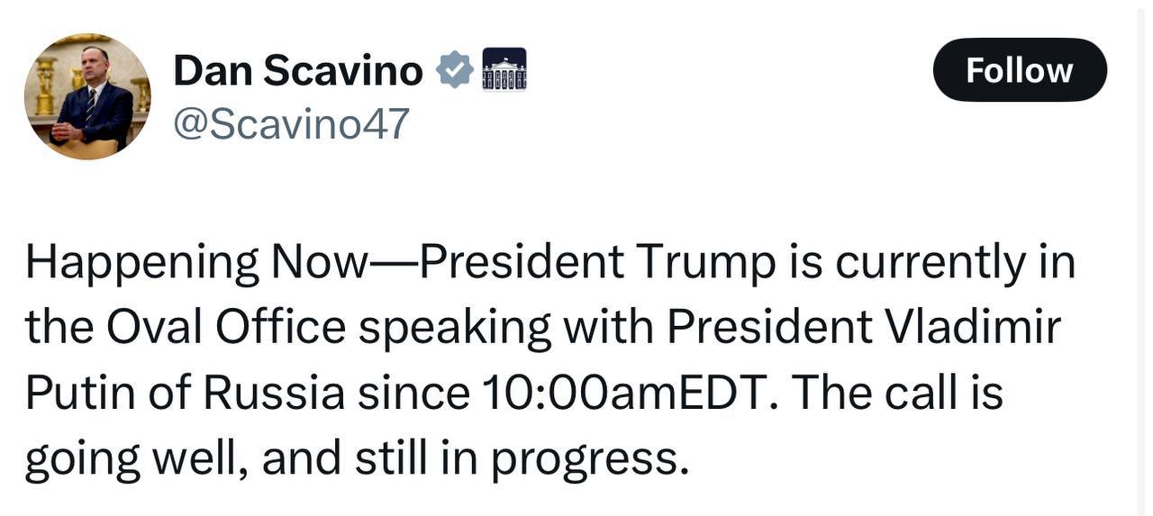 ⚡️Телефонный разговор Трампа и Путина «идёт хорошо» — Белый дом