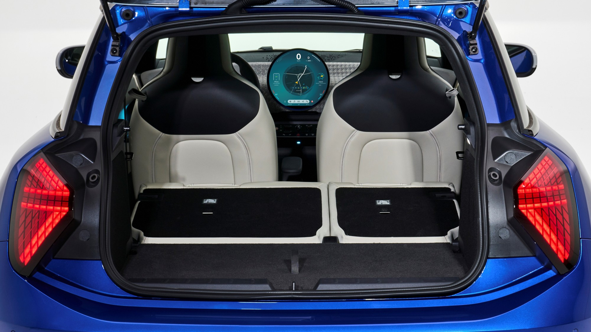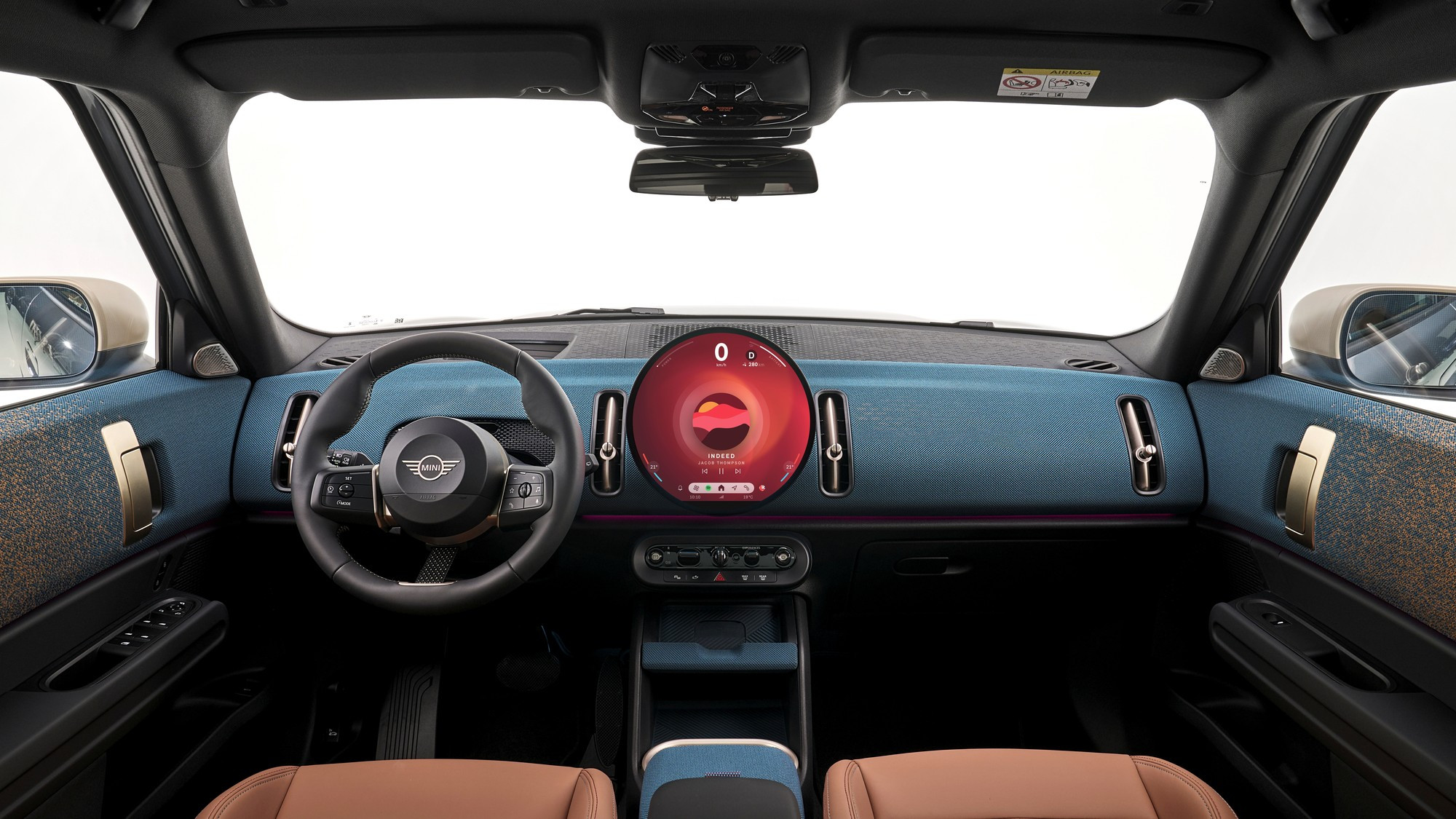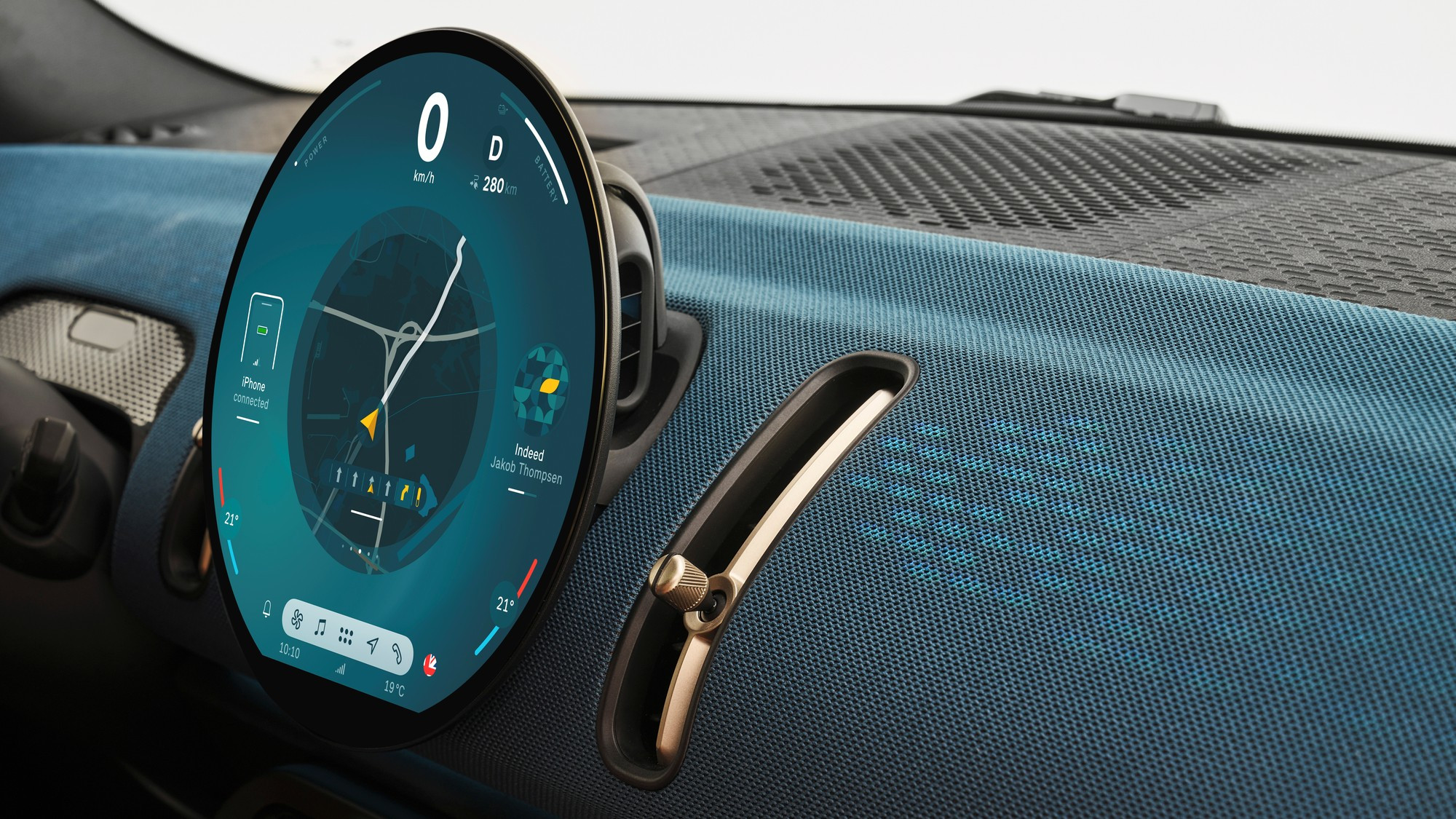 Под круглый экран разработана собственная операционная система Mini 9 на движке Android с виртуальным ассистентом Спайком и несколькими вариантами «обоев», в том числе в стиле классического хронографа. Под мультимедийным экраном есть небольшой пульт с физическими клавишами, на него вынесены селекторы ездовых и дизайнерских режимов, флажок запуска силовой установки, кнопка стояночного тормоза и «крутилка» громкости аудиосистемы.