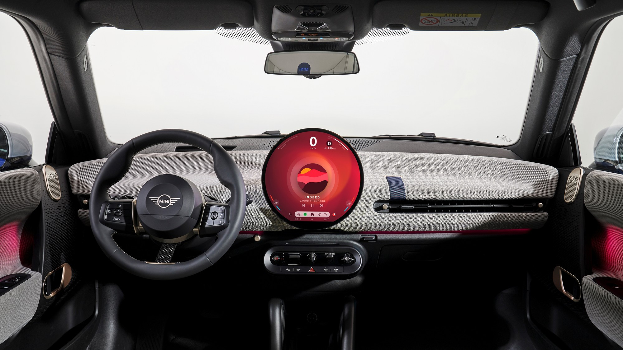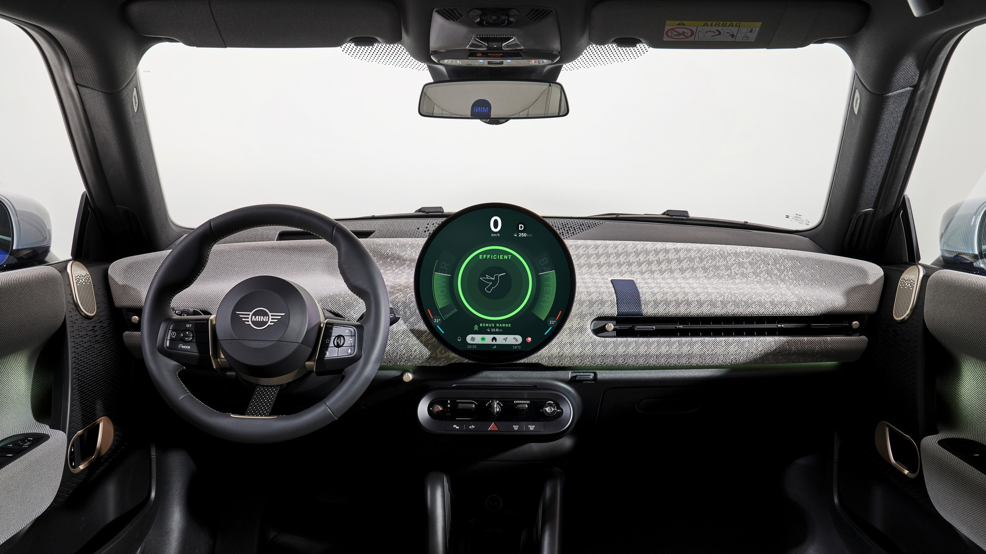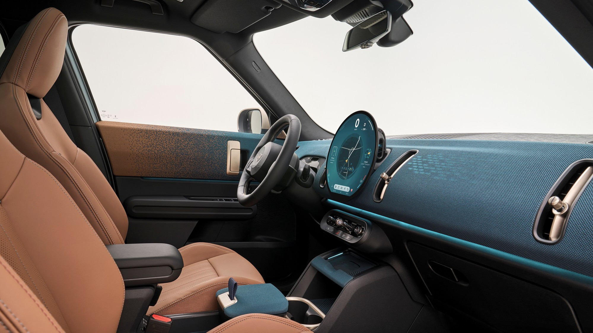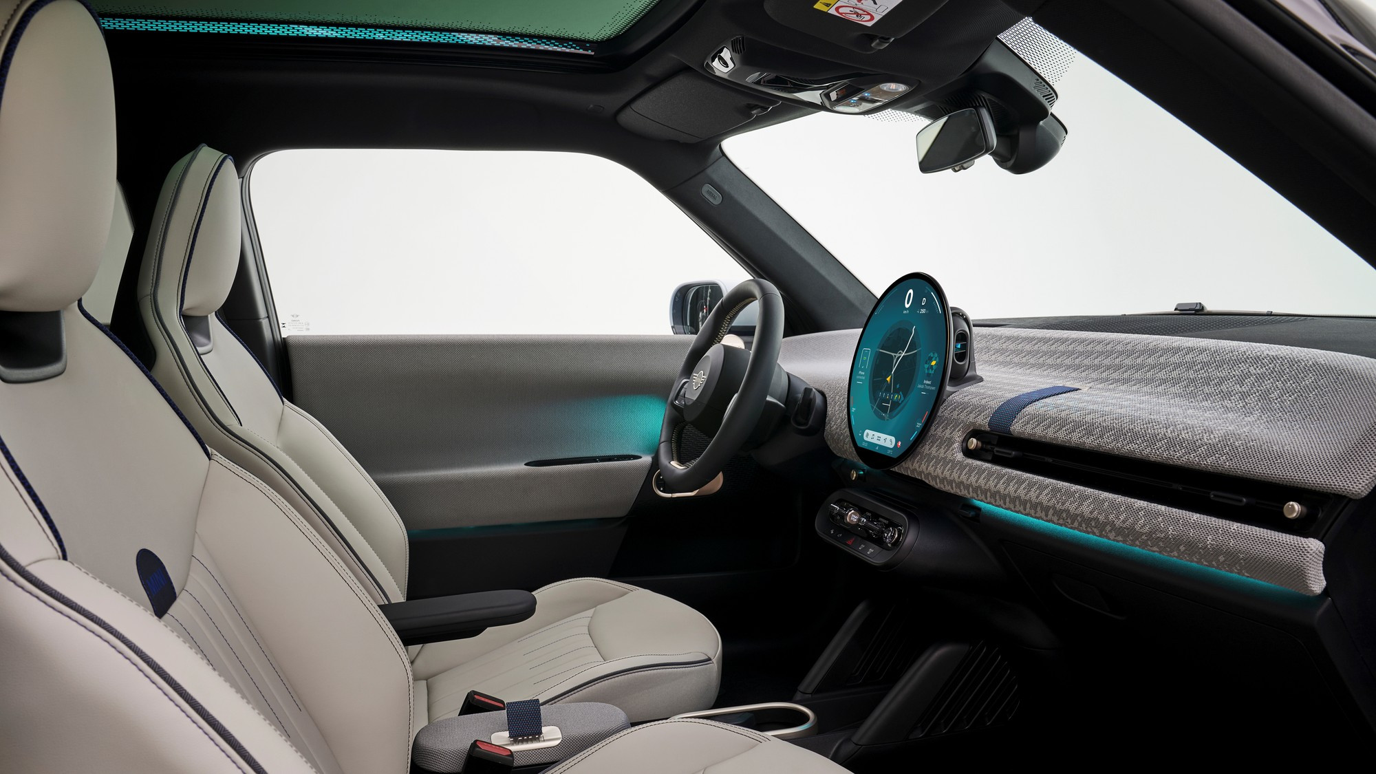 Салон тоже визуально упростился, передняя панель и дверные карты обиты текстилем из переработанного полиэстера, кожа на сиденьях искусственная, третья спица на руле — это натянутый тканевый ремешок. Отдельного приборного щитка у Mini больше нет, он интегрирован в центральный круглый мультимедийный экран диаметром 240 мм, а оперативные показания выводятся на проекционный экран на лобовом стекле.