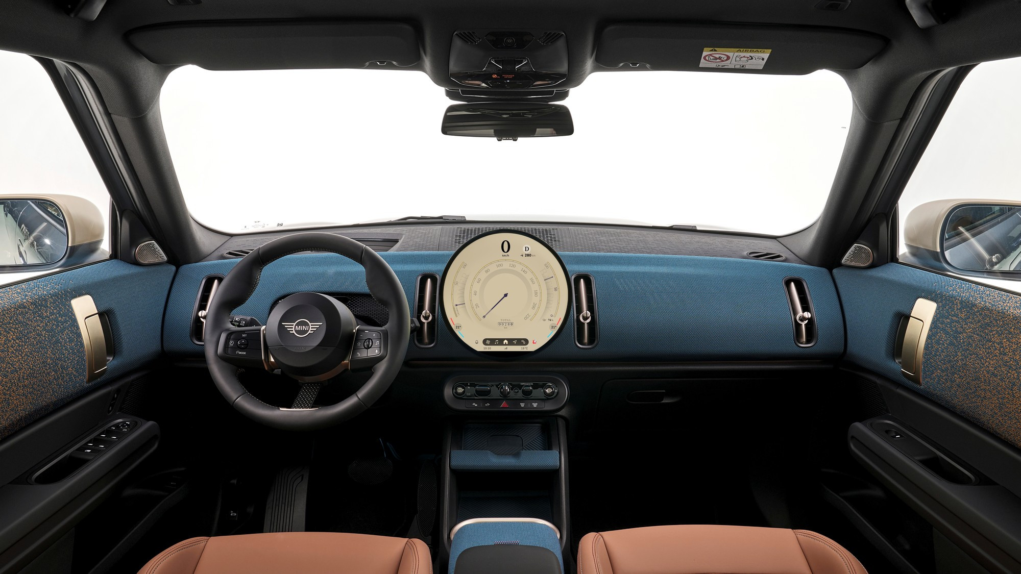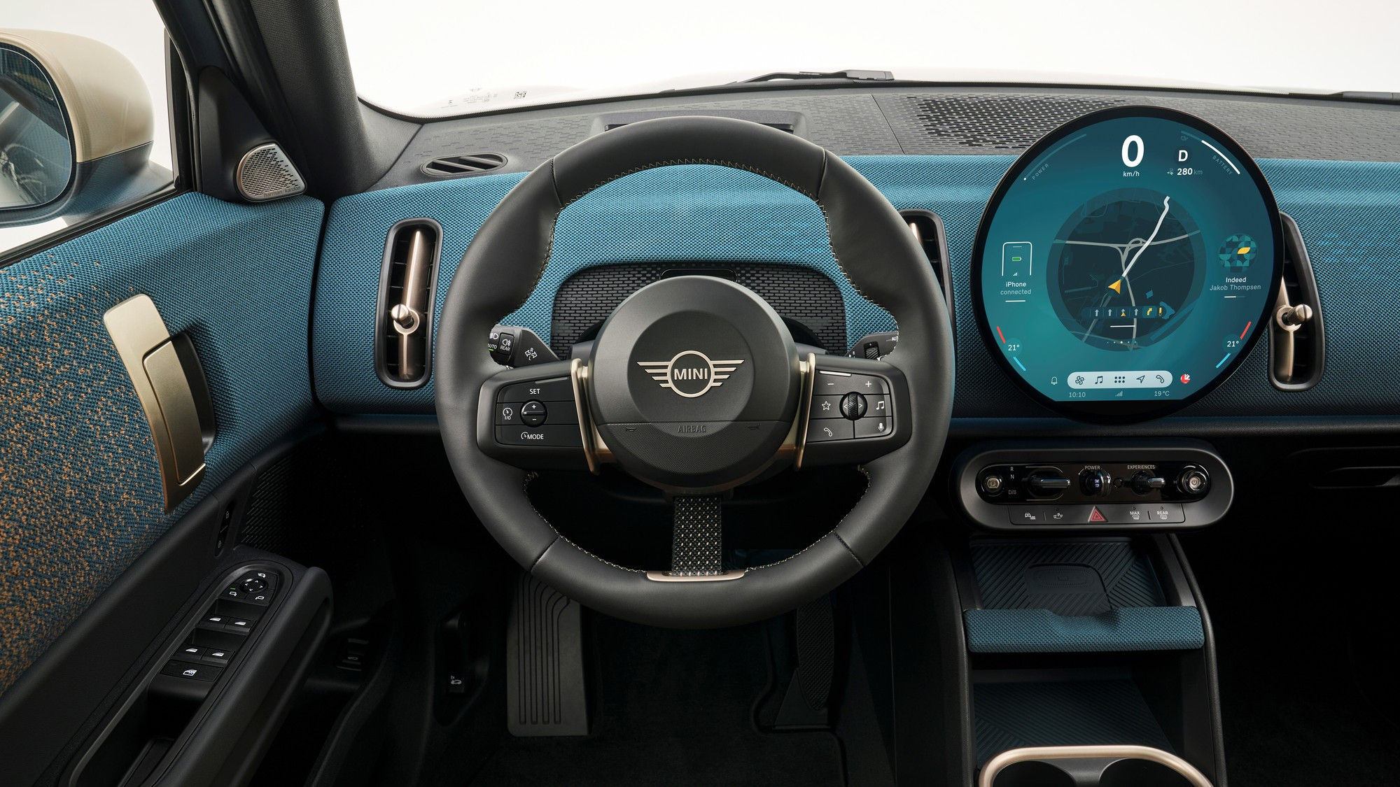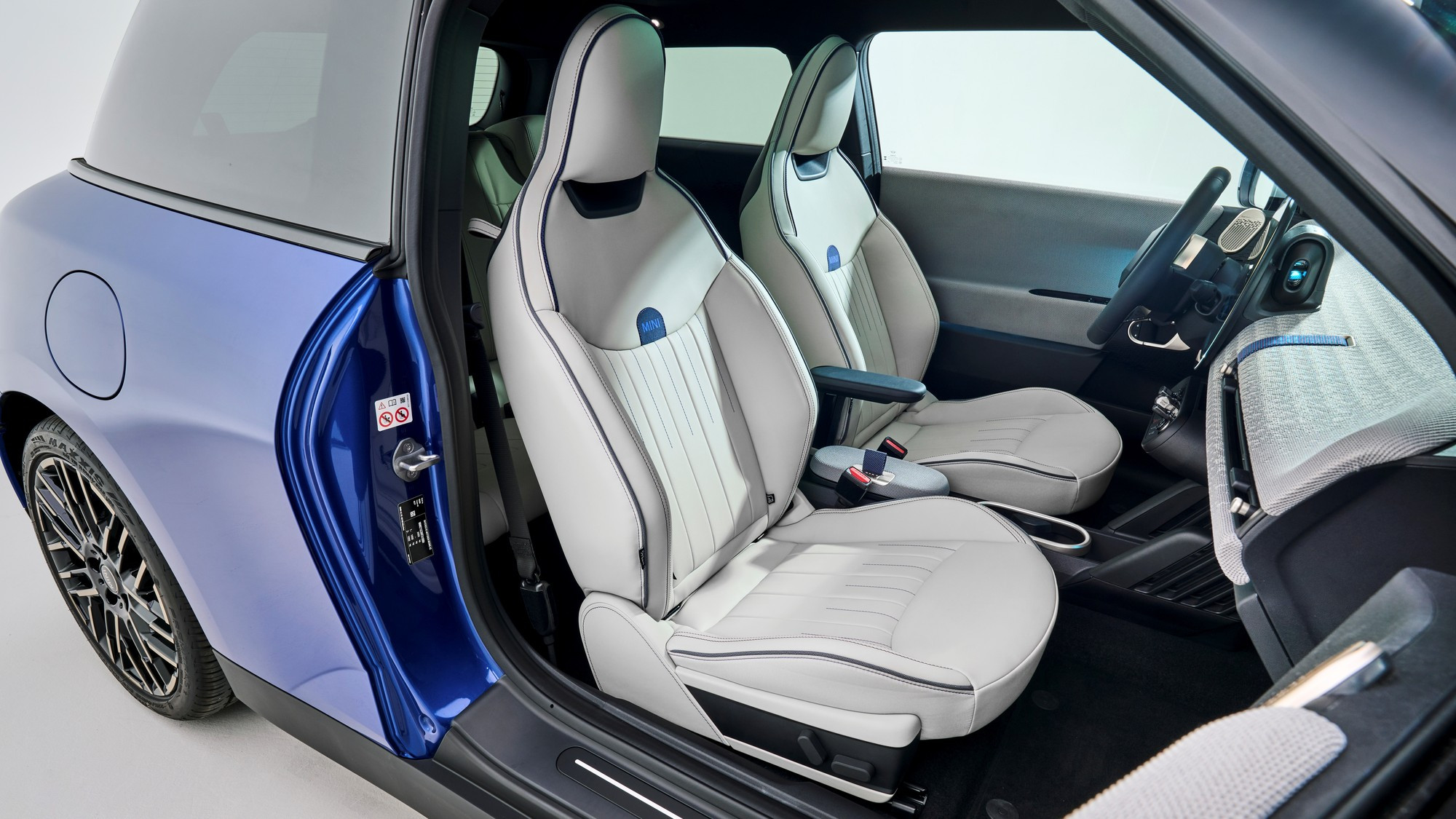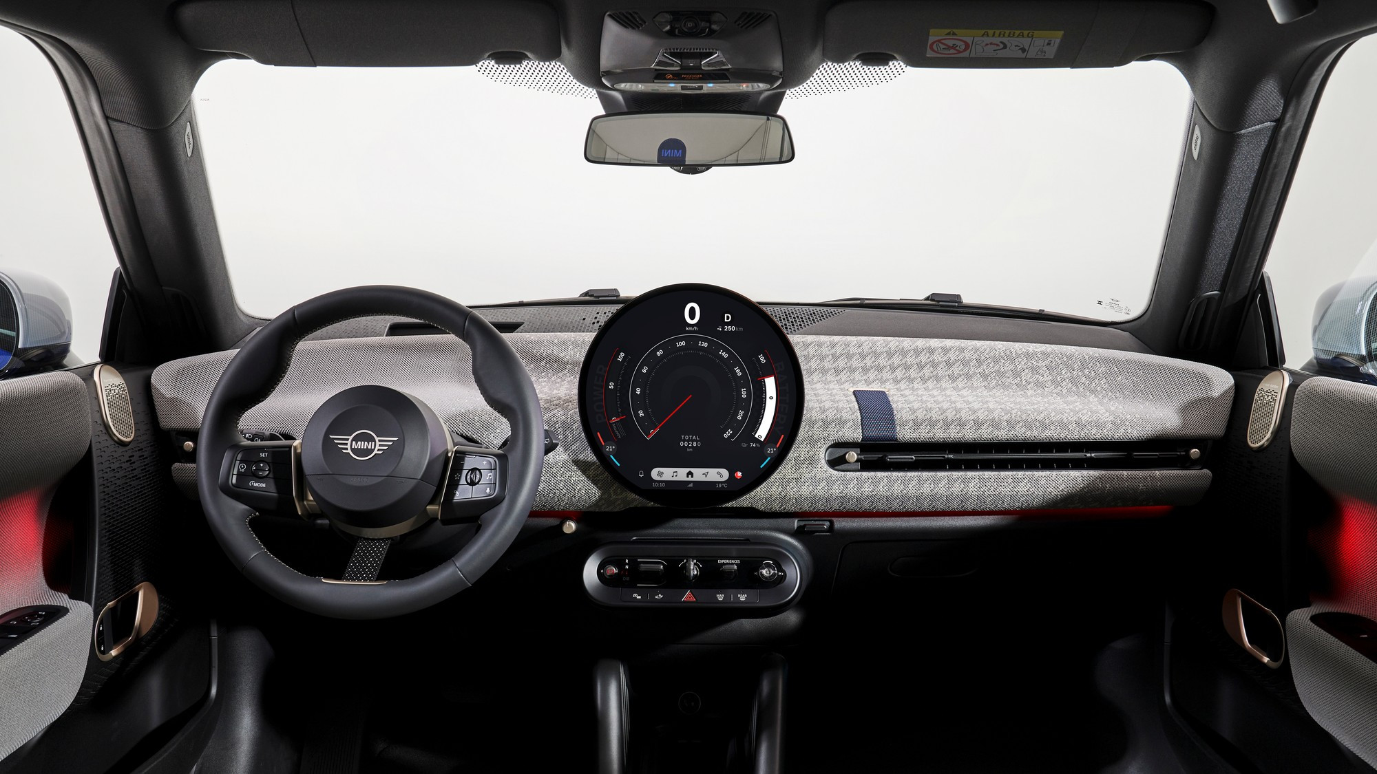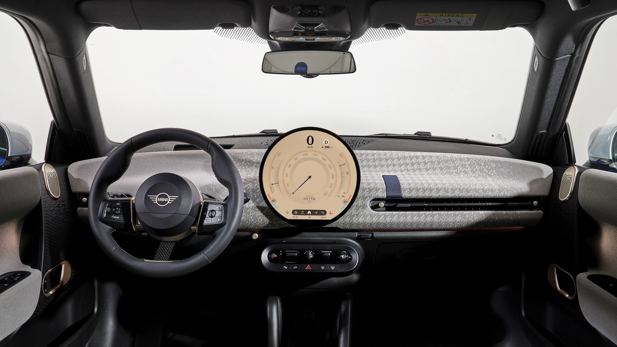 Салон тоже визуально упростился, передняя панель и дверные карты обиты текстилем из переработанного полиэстера, кожа на сиденьях искусственная, третья спица на руле — это натянутый тканевый ремешок. Отдельного приборного щитка у Mini больше нет, он интегрирован в центральный круглый мультимедийный экран диаметром 240 мм, а оперативные показания выводятся на проекционный экран на лобовом стекле.