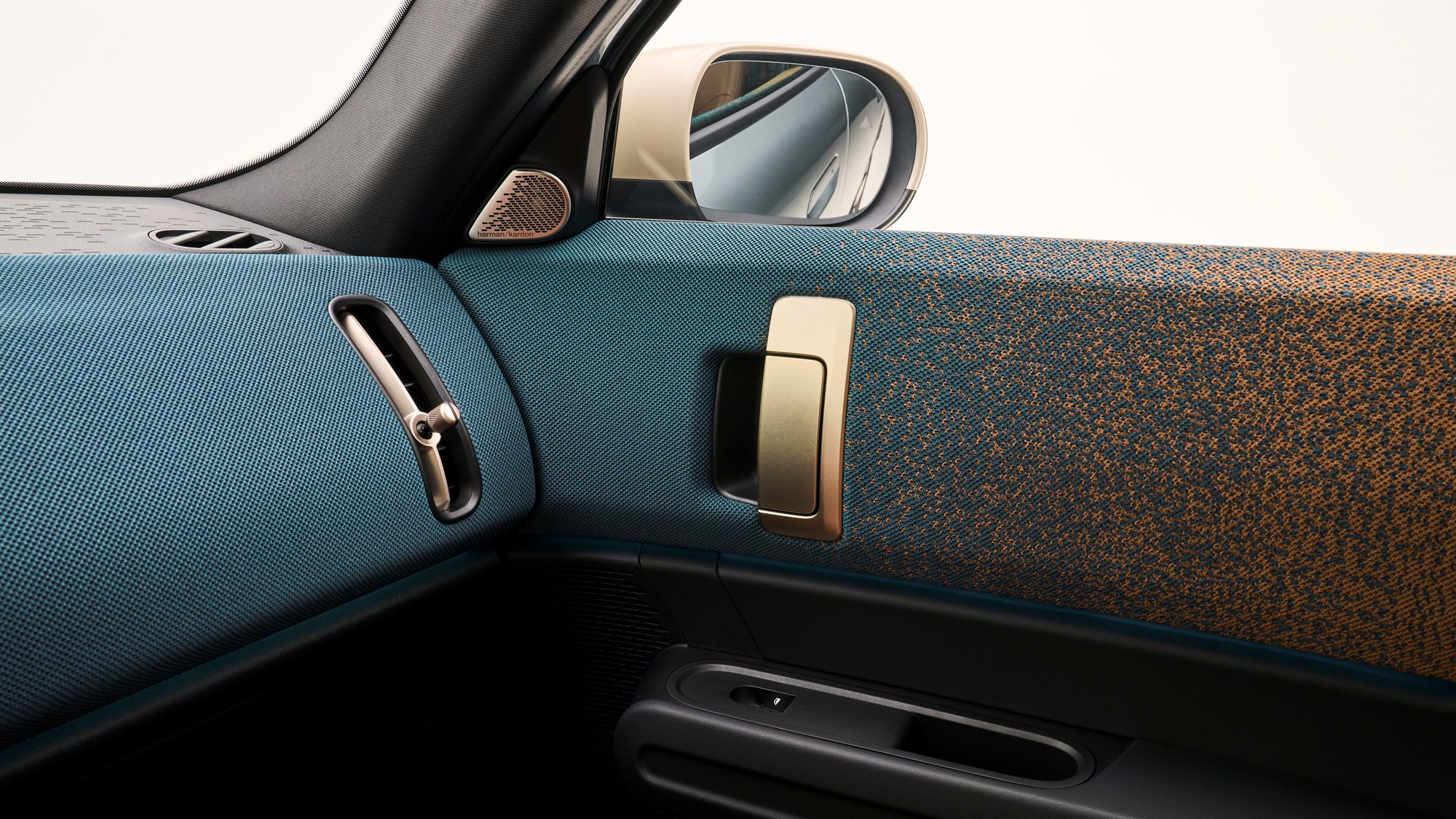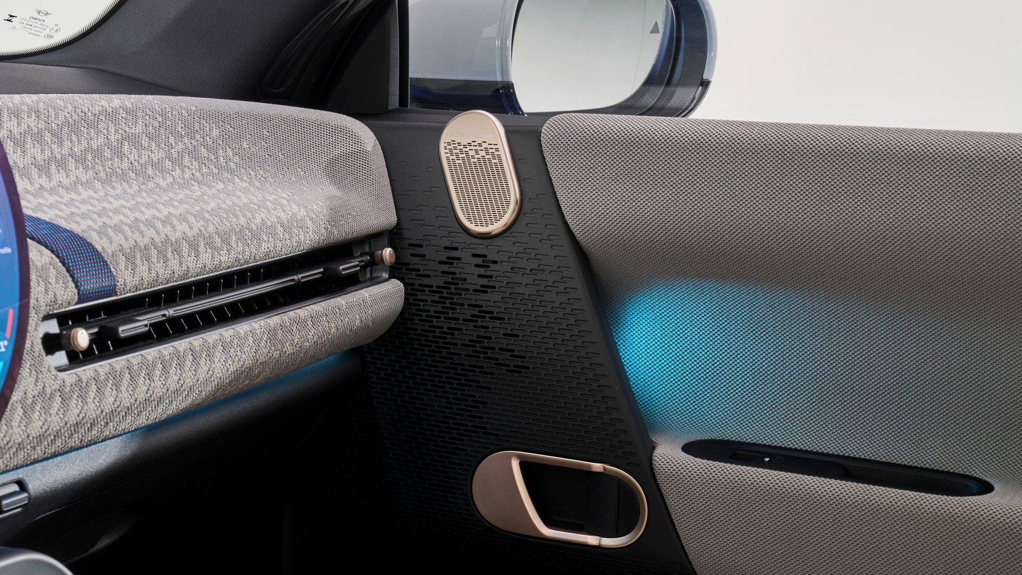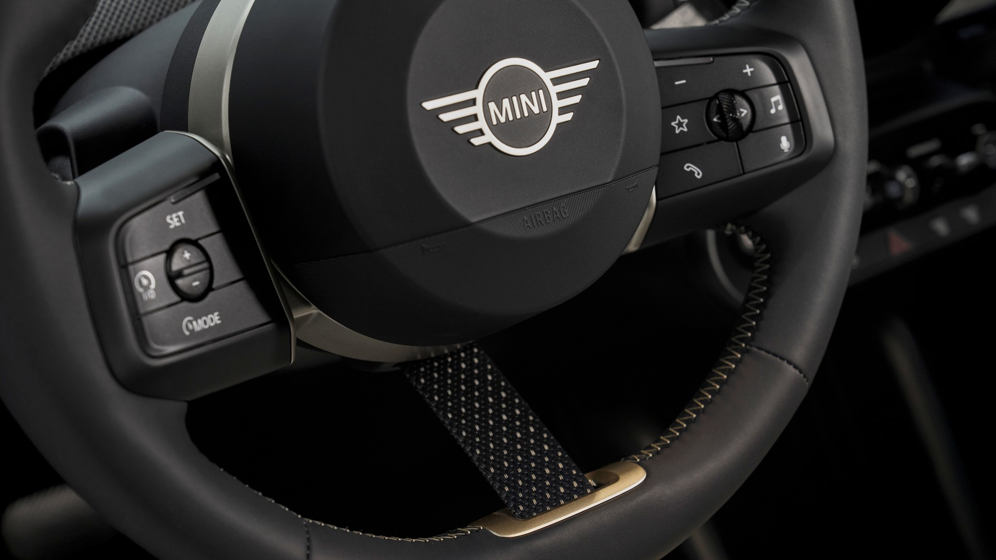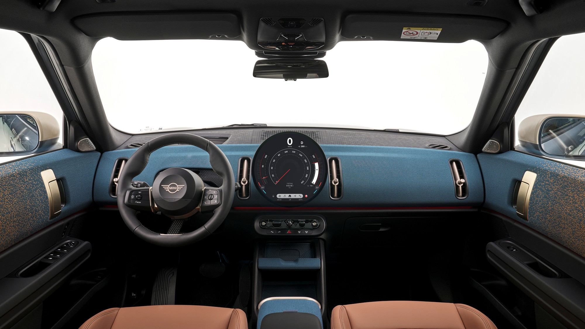 Салон тоже визуально упростился, передняя панель и дверные карты обиты текстилем из переработанного полиэстера, кожа на сиденьях искусственная, третья спица на руле — это натянутый тканевый ремешок. Отдельного приборного щитка у Mini больше нет, он интегрирован в центральный круглый мультимедийный экран диаметром 240 мм, а оперативные показания выводятся на проекционный экран на лобовом стекле.