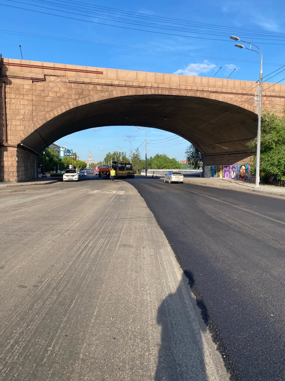 Дорожники уже уложили новое покрытие в одну сторону. Напомним, движение здесь открыли на этой неделе после реконструкции тепловых сетей.