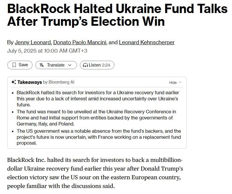 Black Rock приостановил поиск инвесторов для Фонда по восстановлению Украины после победы на выборах Дональда Трампа — Bloomberg