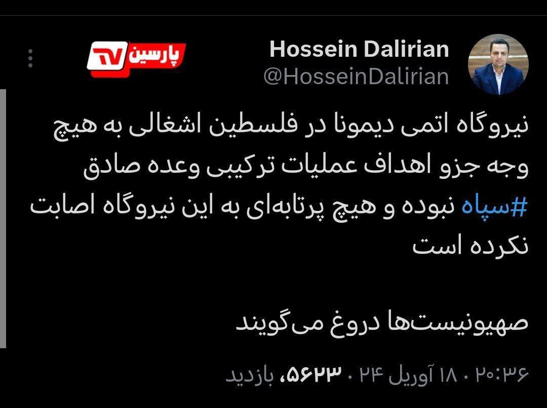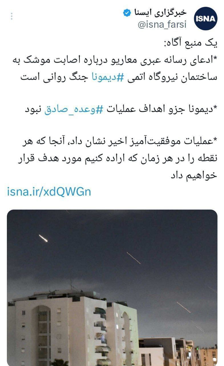 ✔️По данным иранских новостных источников, сообщение израильского издание Maariv о повреждении атомной электростанции Димона в результате ракетного удара Ирана не соответствует действительности
