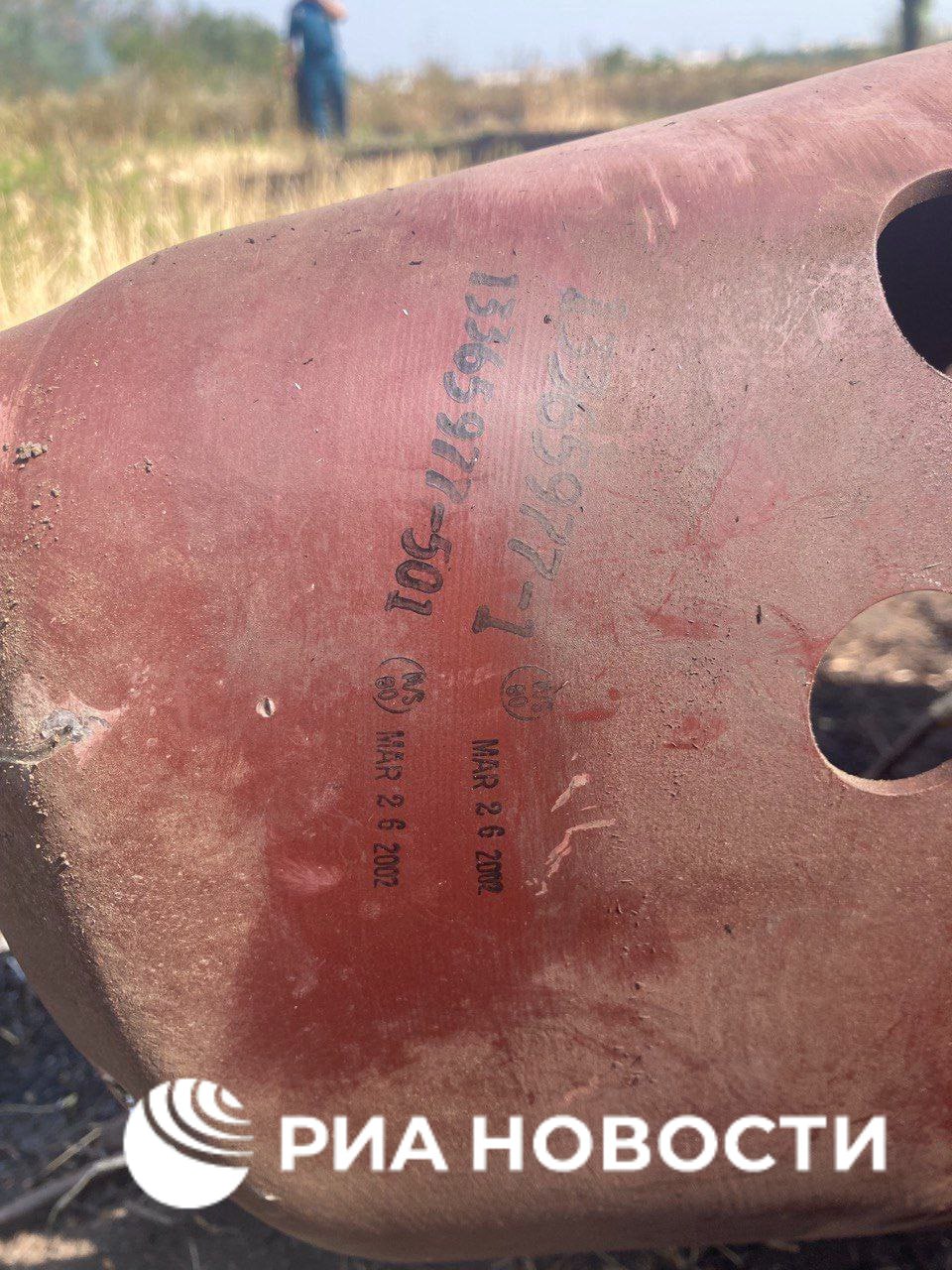 В распоряжение РИА Новости попала фотография одного из осколков сбитой над Луганском ракеты американского производства ATACMS. По маркировке на обломке видно, что ракета произведена 26 марта 2002.