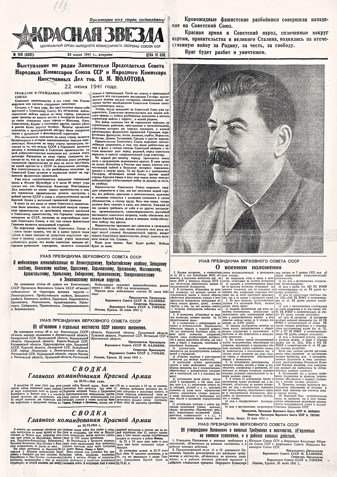 О войне сообщили по радио 22 июня 1941 года в 12 часов 15 минут по московскому времени. 24 июня 1941 года все газеты опубликовали это "Выступление по радио Заместителя Председателя Совета Народных комиссаров Союза ССР и Народного Комиссара Иностранных дел тов. В.М. Молотова от 22 июня". Слева - само выступление, справа (без всякой подписи и так ясно) - портрет Сталина. В подвале, внизу первой страницы, Указы Президиума Верховного Совета СССР о мобилизации, о военном положении и об объявлении его в отдельных местностях СССР и об утверждении Положения о военных трибуналах.
