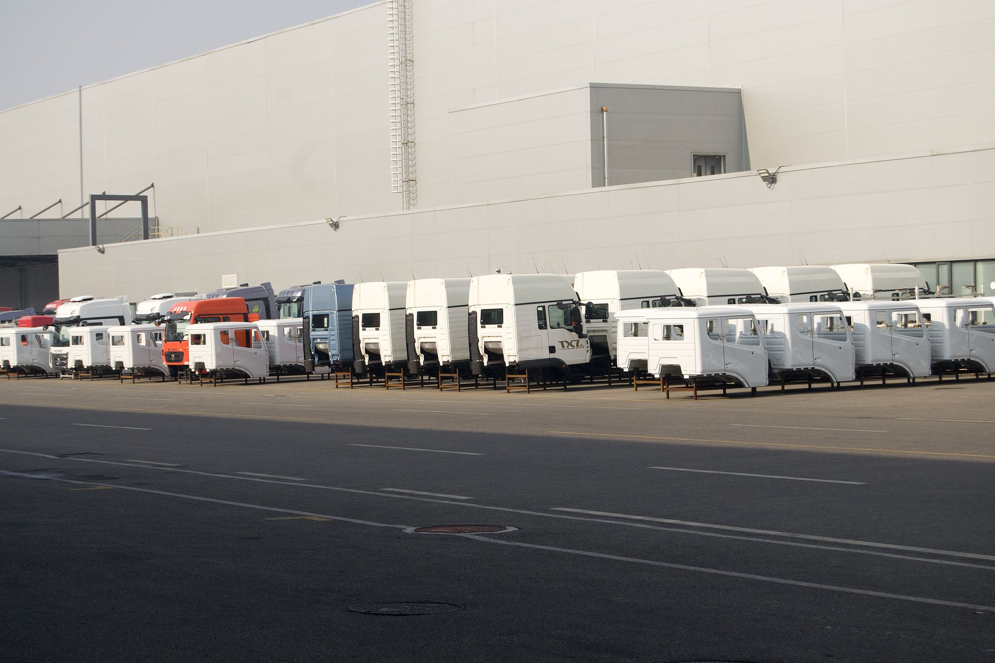 Мы честно пытались выяснить, сколько разных типов автомобилей выпускают на этом заводе. Судя по шасси, которые проплывали мимо нас, больше собирают самосвалов или какой-то другой строительной техники, а не тягачей. Но это не точно: надстройки ставят позже, мы их не увидели, а данными с нами делиться не захотели. Мы даже не смогли посчитать количество вариантов кабин: их множество для всей линейки выпускаемой на заводе техники, и единственное, что мы выяснили, это особенность кабин машин для России: у них нет окошка в задней стенке. Так теплее, а зачем оно нужно на китайских самосвалах или тягачах, нам всё равно никогда не понять.