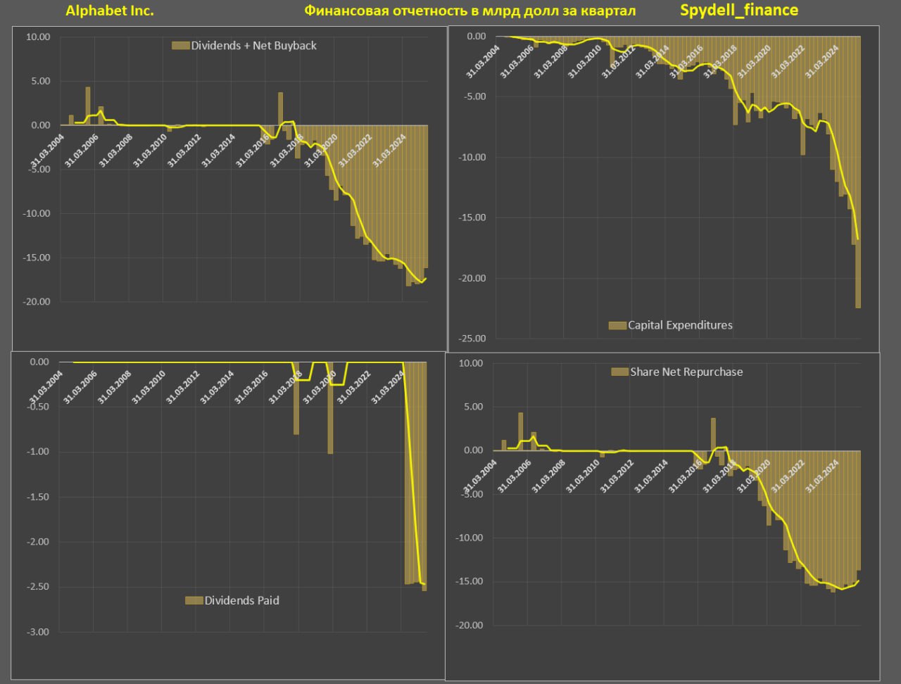 Акцент сильно смещен в пользу капитальных расходов в ущерб акционерной политики, темпы роста финансовых показателей замедляются, ИИ хайп пока на словах и метриках, но нет конверсии в финансовый поток.