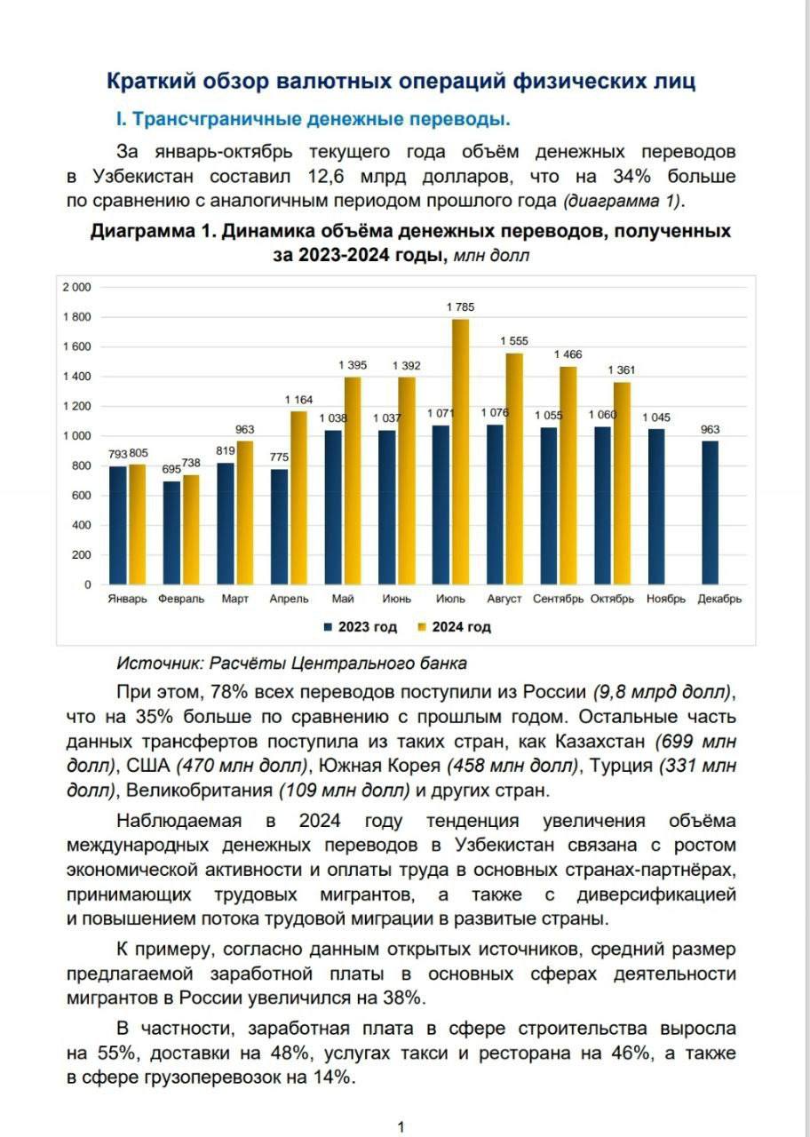 За первые 10 месяцев этого года в Узбекистан из России было переведено 9,8 миллиардов долларов, что на 35% больше, чем за тот же период 2023 года. Об этом сообщил Центробанк Узбекистана в своем кратком обзоре валютных операций физических лиц с января по октябрь 2024 года.