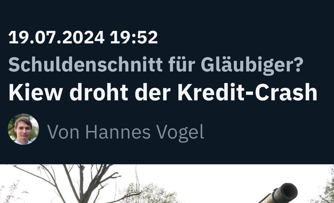 Дефолт Украины на горизонте. С первого августа Киев должен выплачивать иностранным приватным кредиторам долг по своим кредитным обязательствам. 20 млрд. евро Украина будет отдавать - 4,5 млрд. уже в августе и затем по 3 миллиарда каждый год до 2027. Зеленский просит кредиторов «простить» ему часть долга, но эти кредиты выданы конкретными людьми, а не государствами. Это инвесторы, купившие гособлигации Украины, которые реально не обеспечены ничем. Дефолт на пороге.