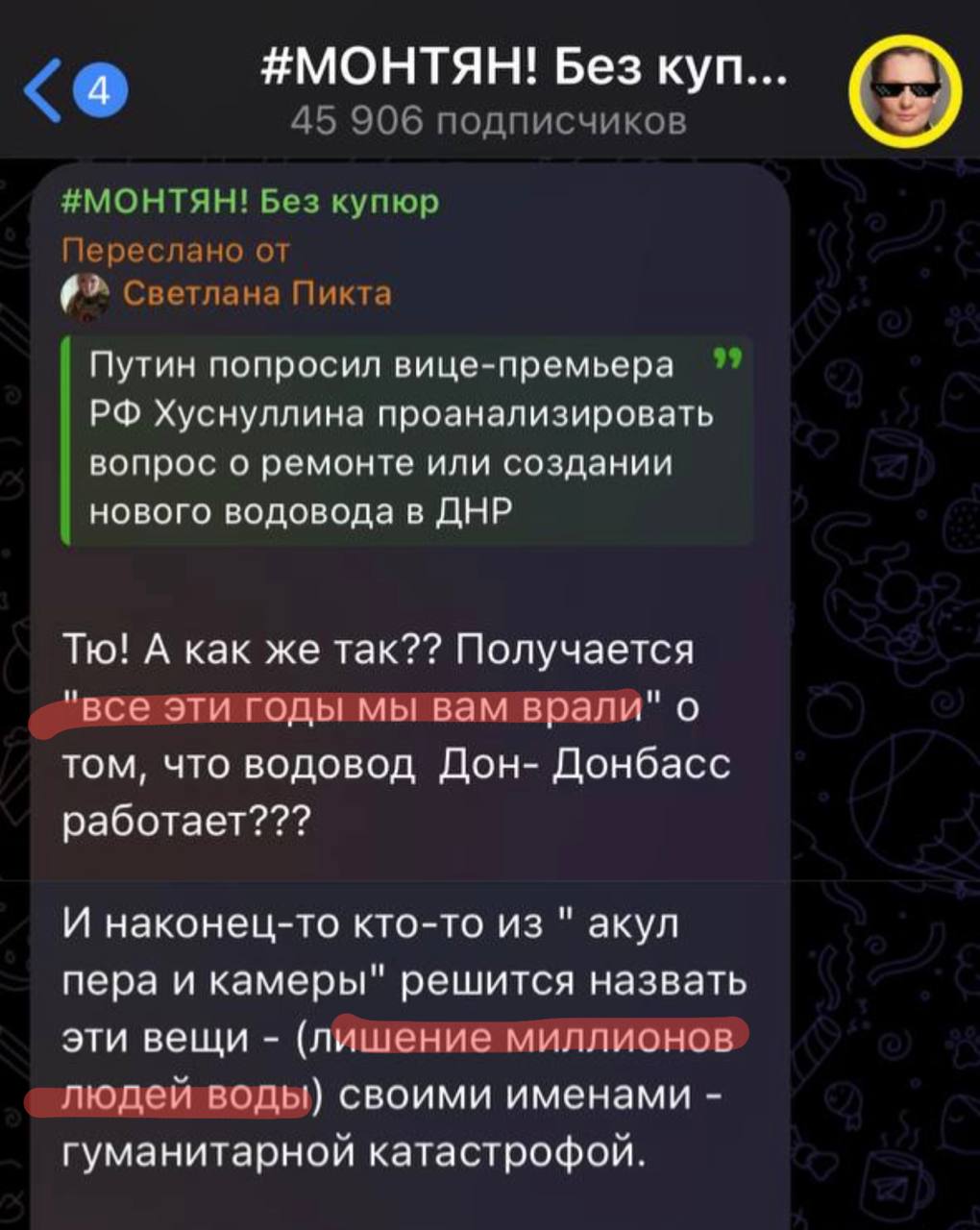 Тем не менее, нагнетание антироссийских настроений («лишение миллионов людей воды» - каково?) на Донбассе, за который сейчас проливает кровь Армия России, продолжается.