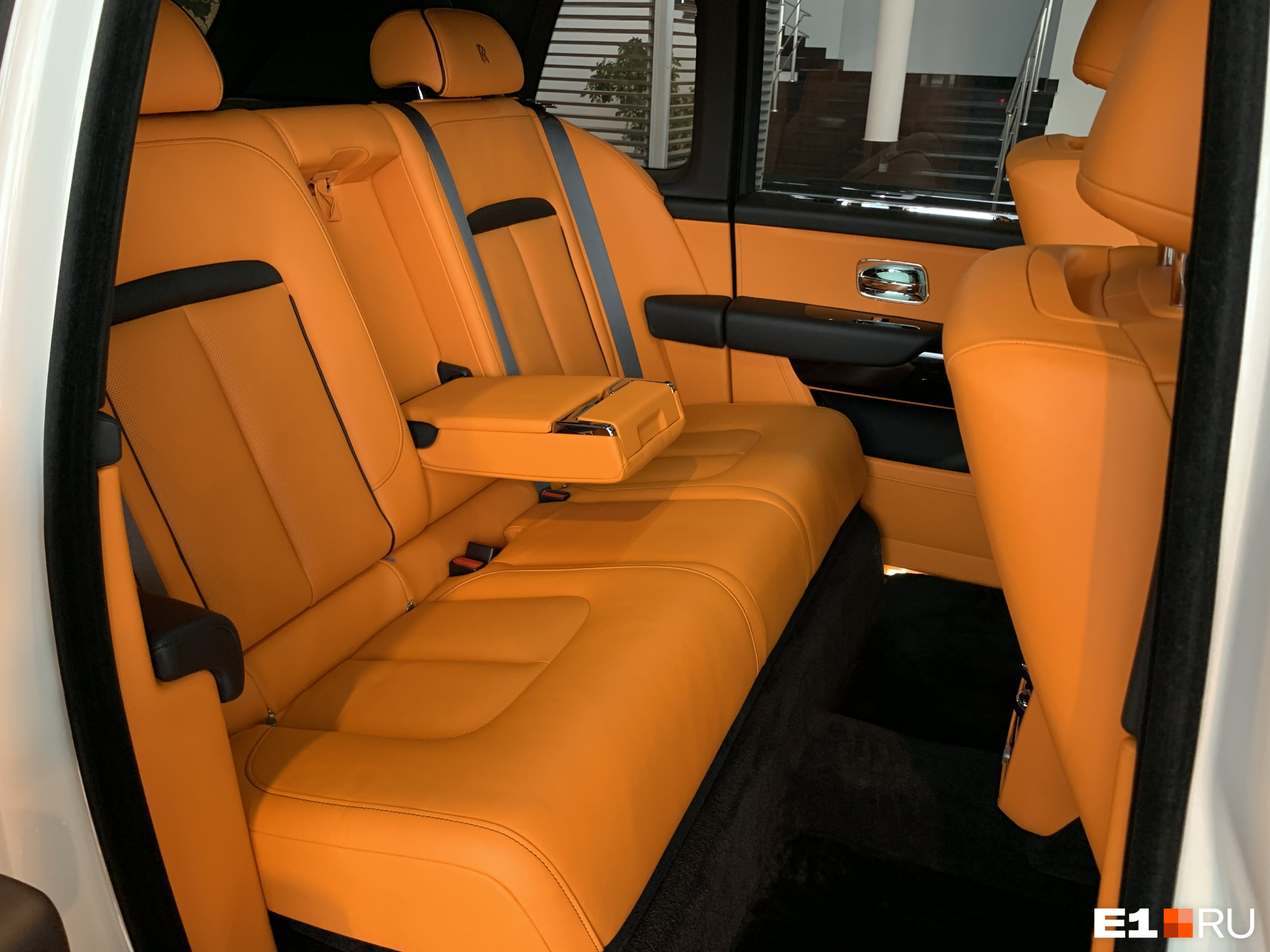 Rolls-Royce Cullinan может поставляться с различными вариантами отделки салона, в том числе с учетом пожеланий заказчика. Здесь у нас оранжевый кожаный салон с черными коврами из натурального меха.