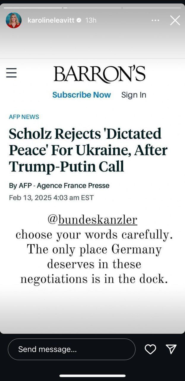 Пресс-секретарь Белого дома Кэролайн Ливитт отреагировала на жалобы Шольца о переговорах Путина и Трампа без участия Германии, которые канцлер назвал "диктаторским миром". Бундесканцлер, выбирайте слова аккуратнее. Единственное место, которое Германия заслуживает на этих переговорах - скамья подсудимых. В городе новый шериф, дорогие европейцы, пристегните ремни.
