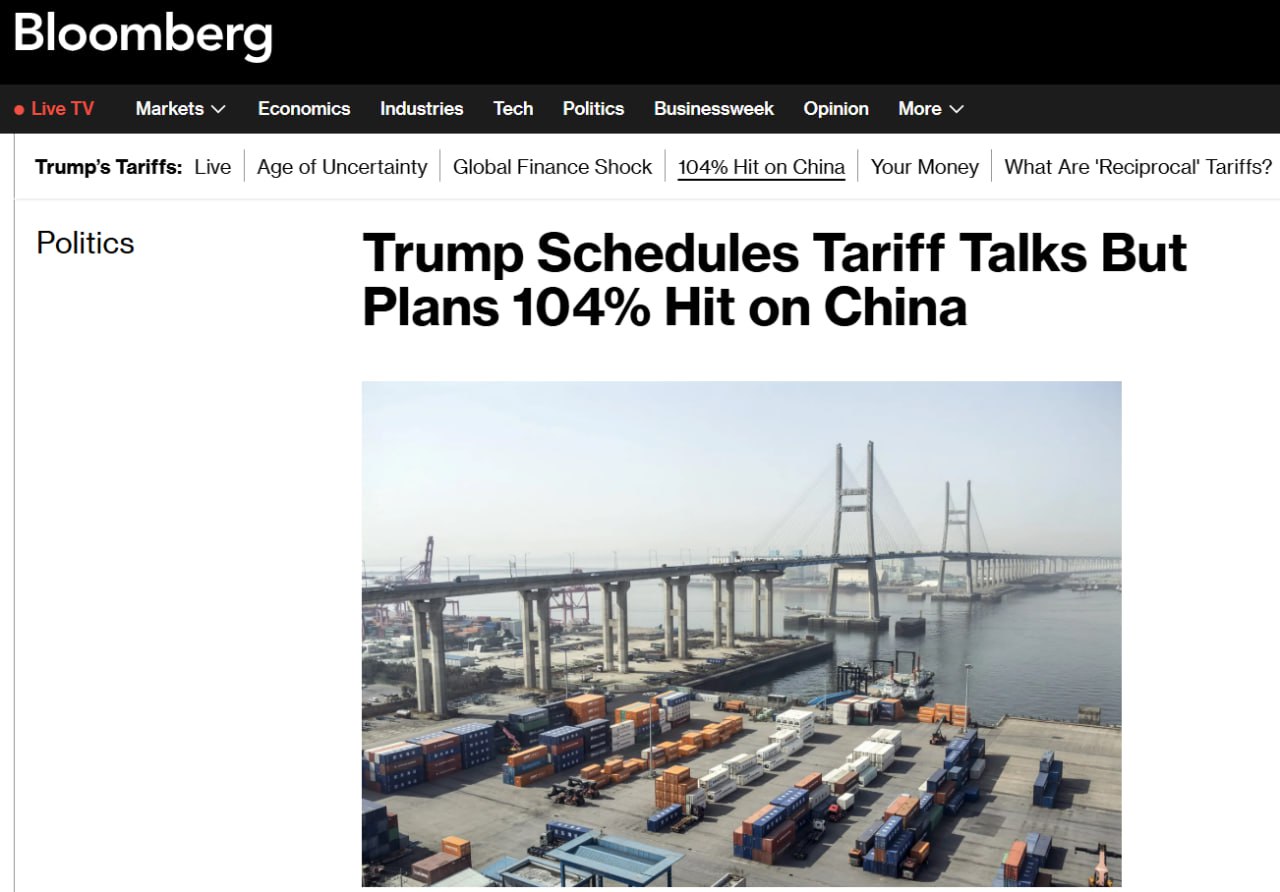 🇺🇸✖️🇨🇳 Трамп введёт 104% пошлины против Китая в среду