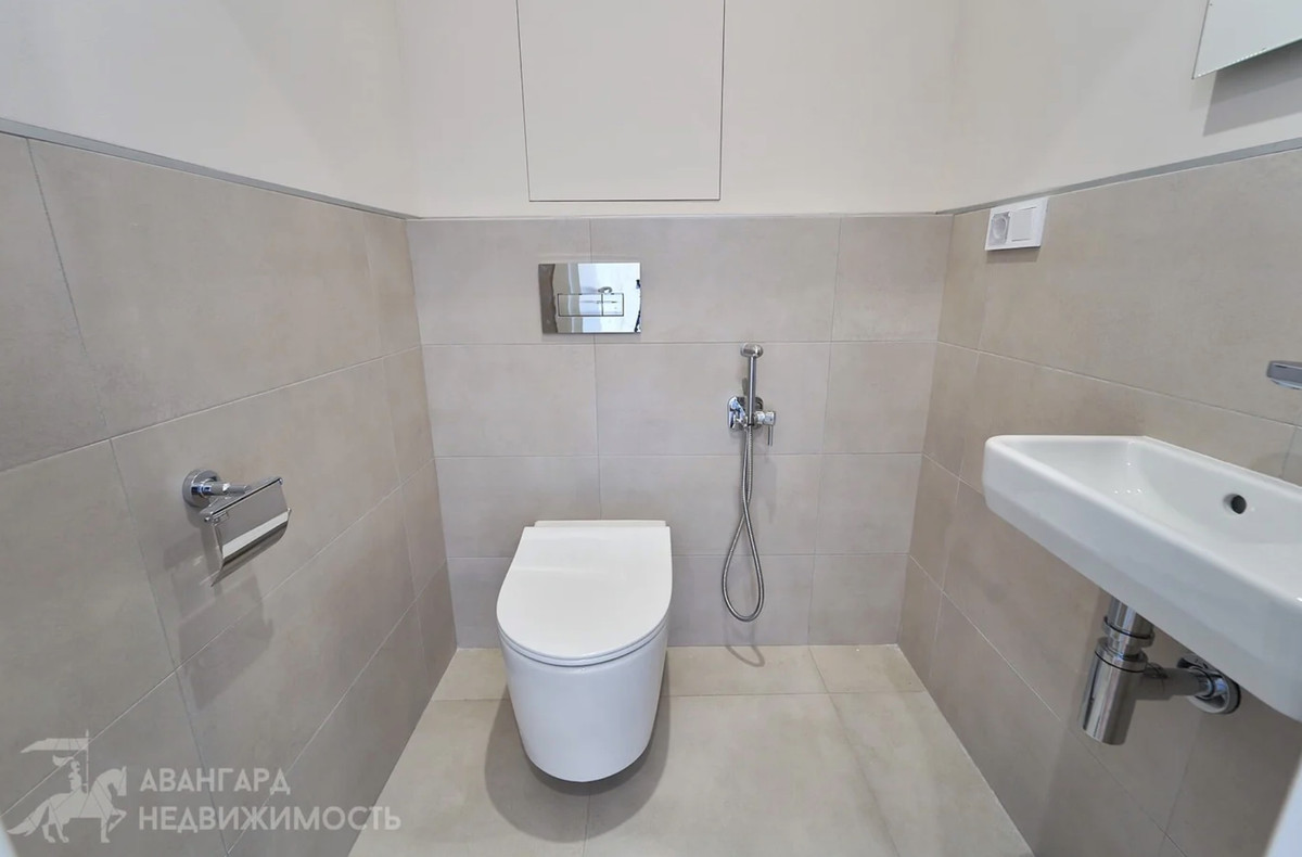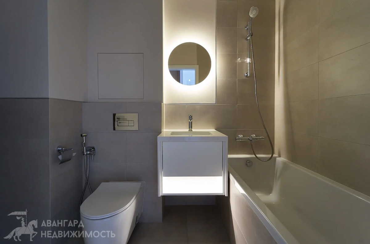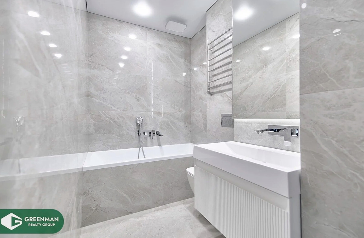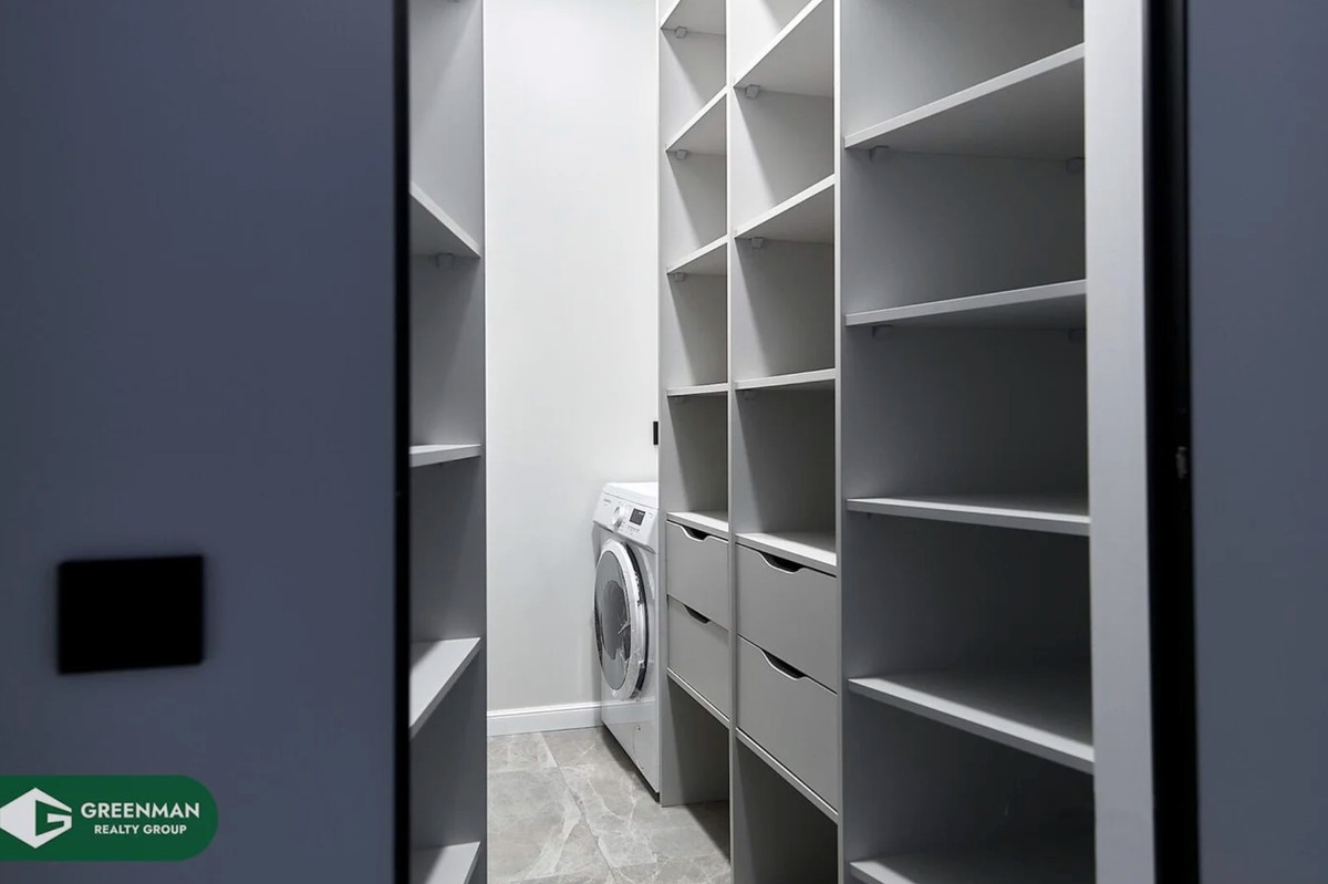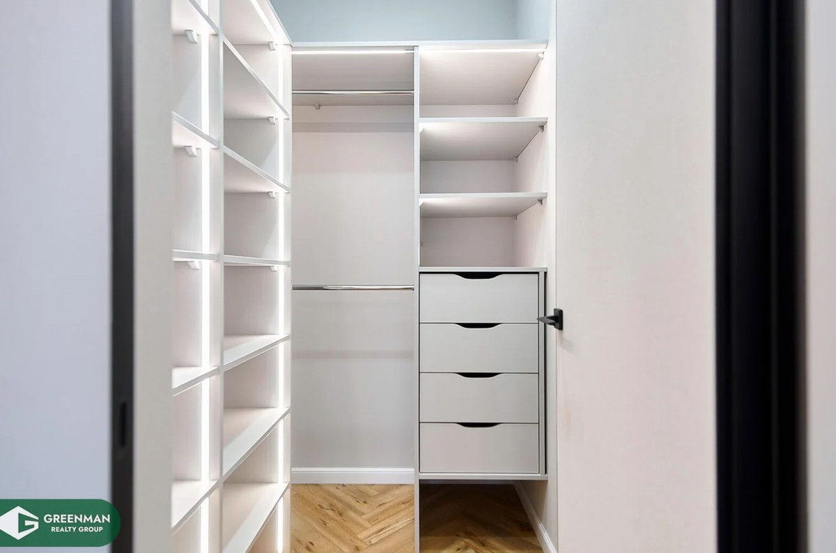 Интерьер выполнен в светлых тонах, из наполнения — кухня с бытовой техникой, сантехника в ванных комнатах, стиральная машина и встроенные системы хранения по всей квартире. Мягкую мебель, декор и другие элементы дизайна придется продумывать новому владельцу. Для кого-то это плюс — не нужно переплачивать за чужой вкус.