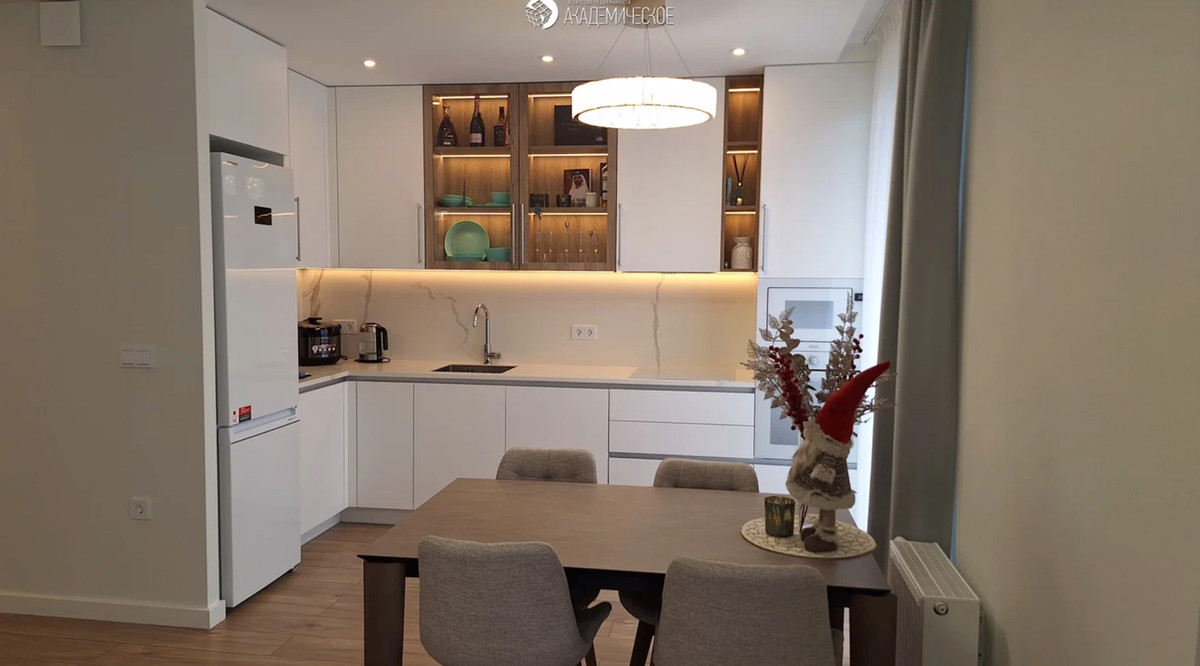 Обстановка выдержана в светлой гамме с элементами неоклассики: акцентные люстры в золотом цвете, фасады с филенками, глянцевый керамогранит с мраморной текстурой на полу. В прихожей — зеркальные шкафы, визуально расширяющие пространство.