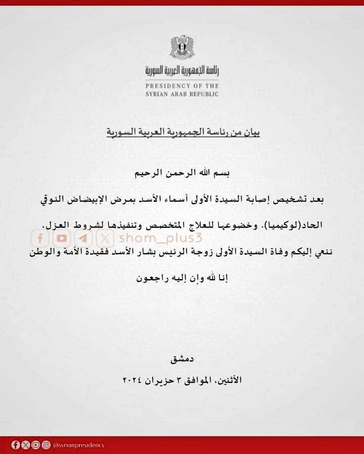 ⚡️Офис президента Сирии неожиданно объявил о смерти жены Башара Асмы аль-Асад, а затем удалил это сообщение.