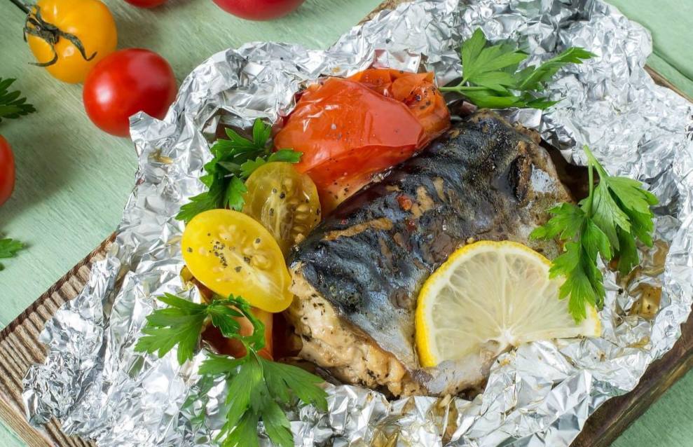 5․ Отрежьте четыре кусочка фольги. На каждый положите рыбу и помидоры. Сбрызните маслом и лимонным соком.