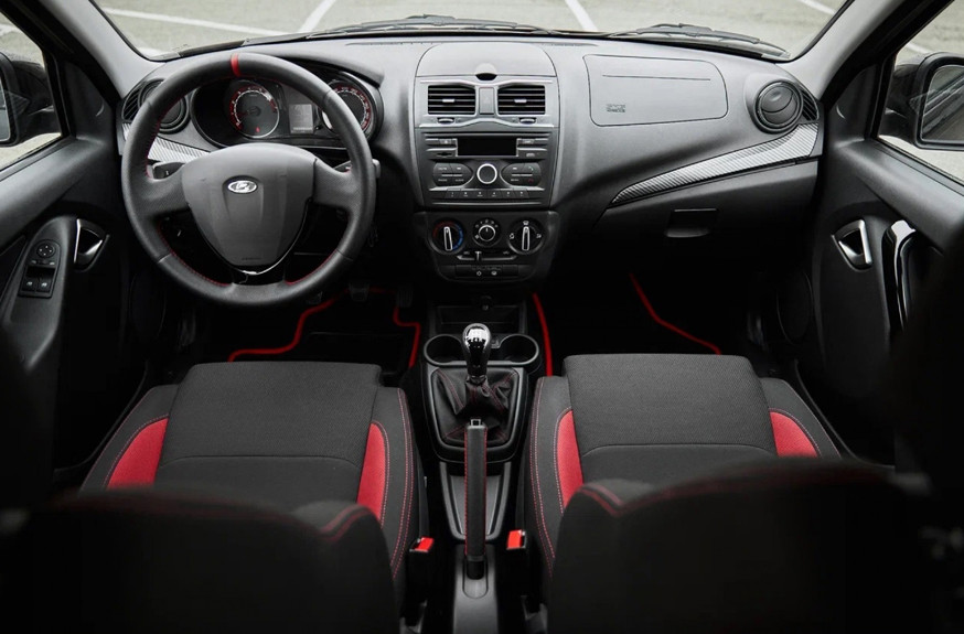 В салоне тоже есть своя доля отличий: так, седан и хэтчбек Lada Granta Sport получили контрастную отделку с красными декоративными элементами, а рулевое колесо с красной же нулевой отметкой – кожаную оплётку. Этот же яркий цвет используется при оформлении щитка приборов. Передние кресла у спортивных Грант имеют выраженную боковую поддержку.