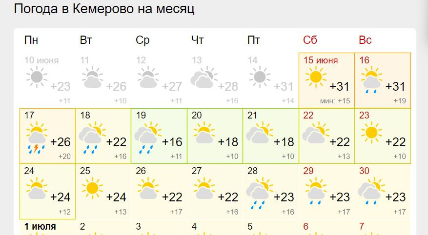 В Кузбассе наконец-то тепло: столбик термометра на этих выходных может показать выше +30 градусов. Но так будет не всегда и, судя по прогнозам, уже на следующей неделе нас ждет похолодание и дожди. Посмотрели прогноз погоды на остаток июня в разных специализированных сервисах и вот, что они нам обещают.