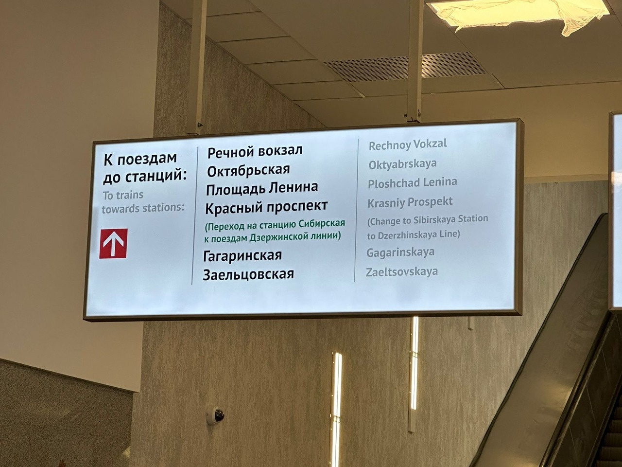 На станции метро «Спортивная» в Новосибирске смонтировали и установили первый указатель. Он указывает направление в сторону правого берега.