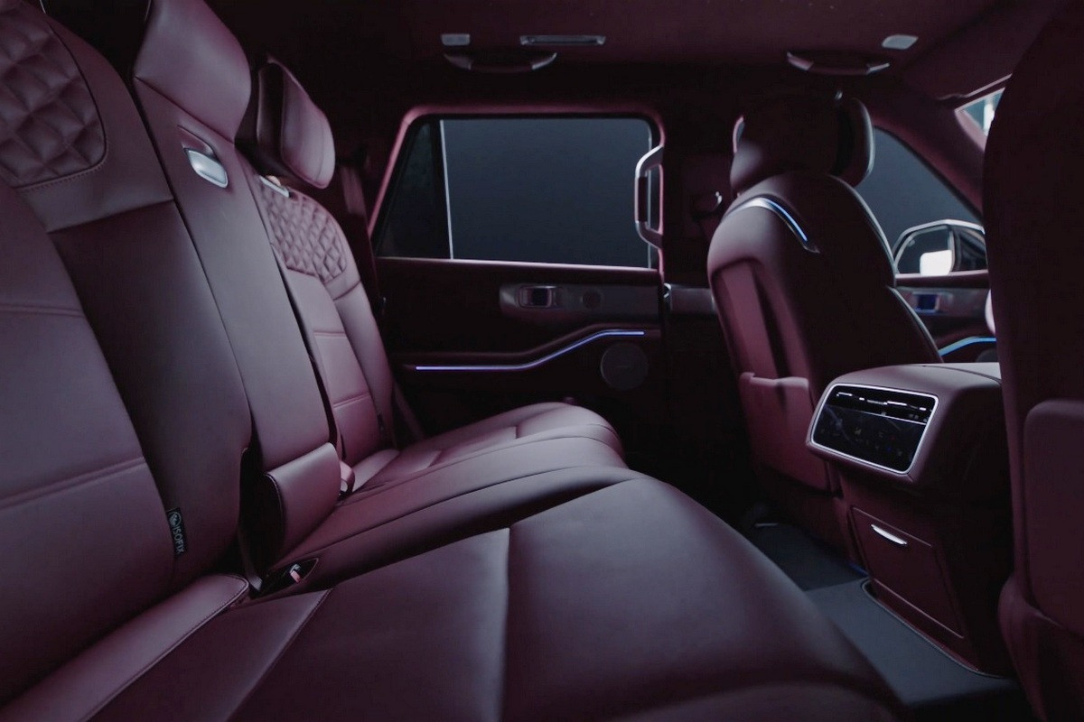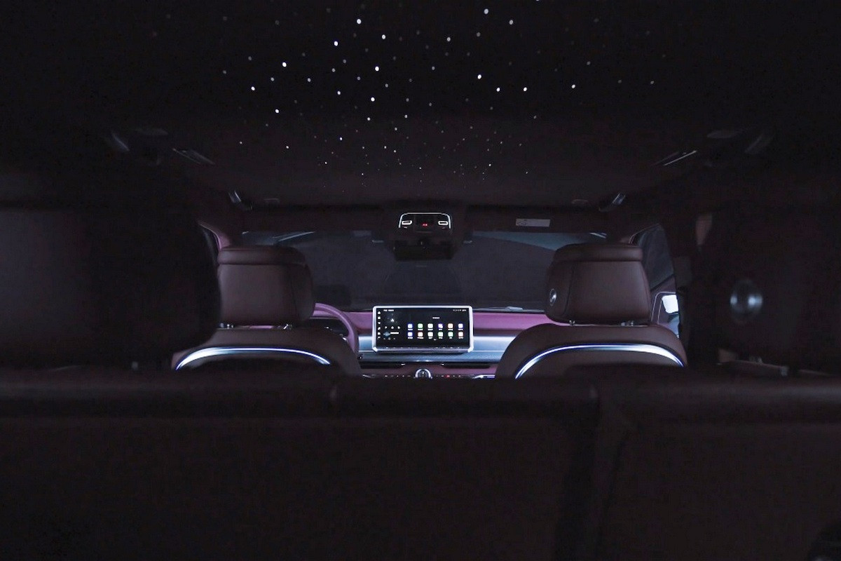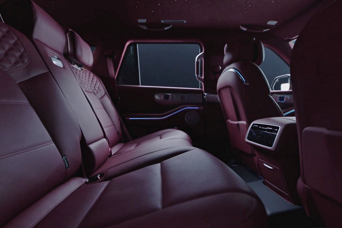 В пятиместном салоне – отдельные экраны приборки и мультимедиа-системы, у задних пассажиров есть свой блок управления «климатом». На потолке особого SUV – «звездное небо», то есть множество диодных точек. Кресла с функцией массажа, а спинки второго ряда могут откидываться назад.