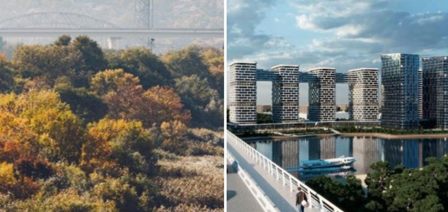 Фото: Левобережная роща и ЖК, который хотят построить на её месте, коллаж 1rnd