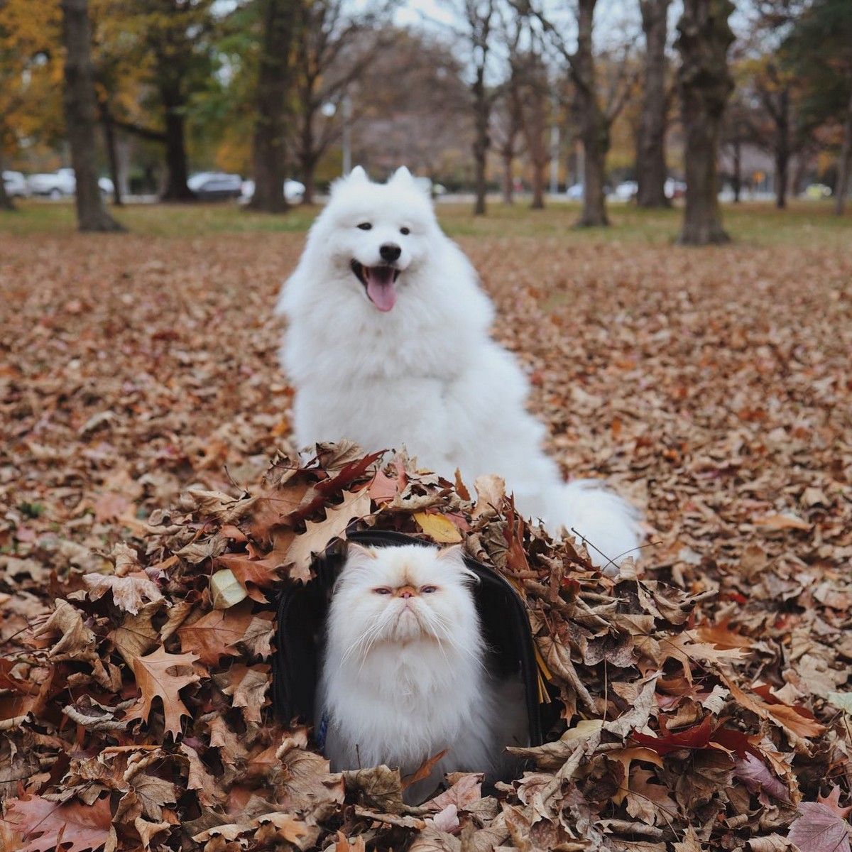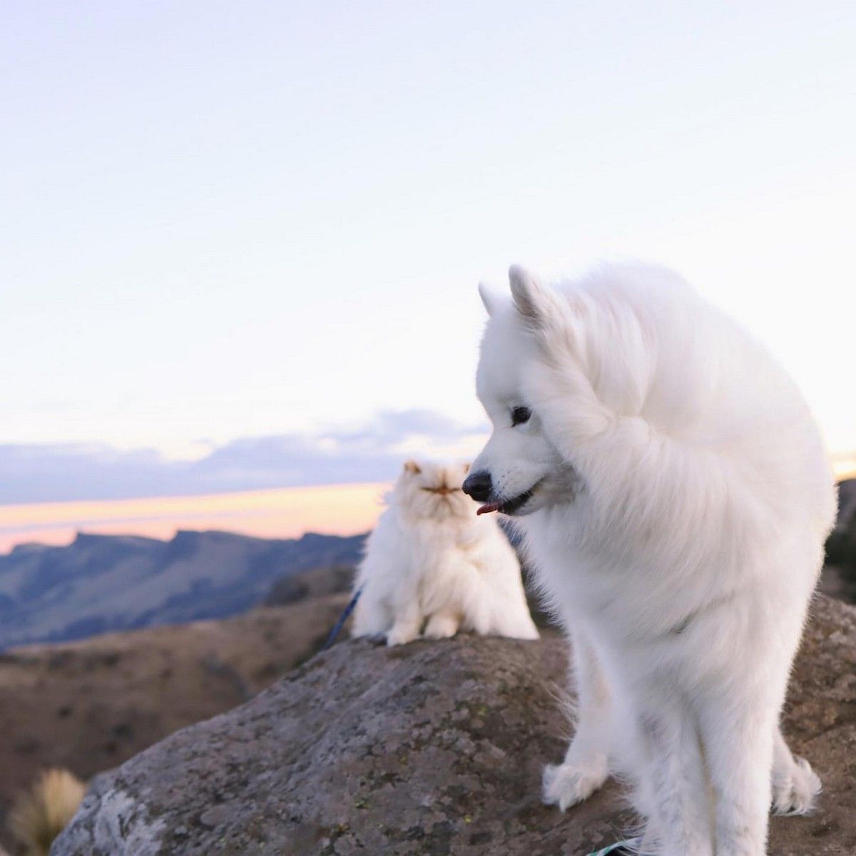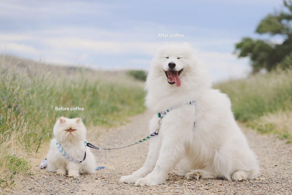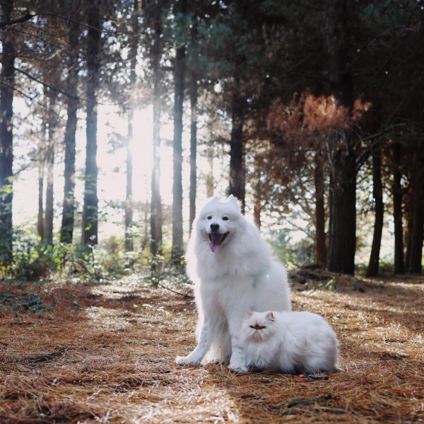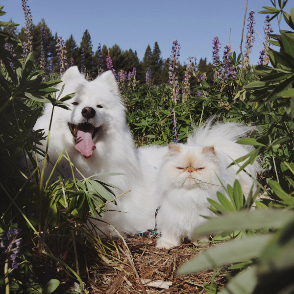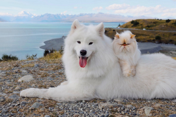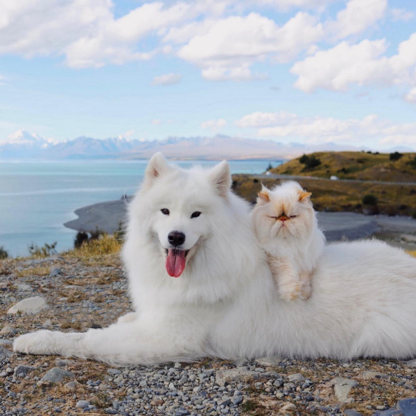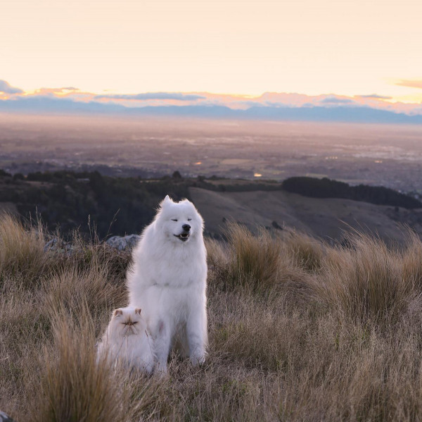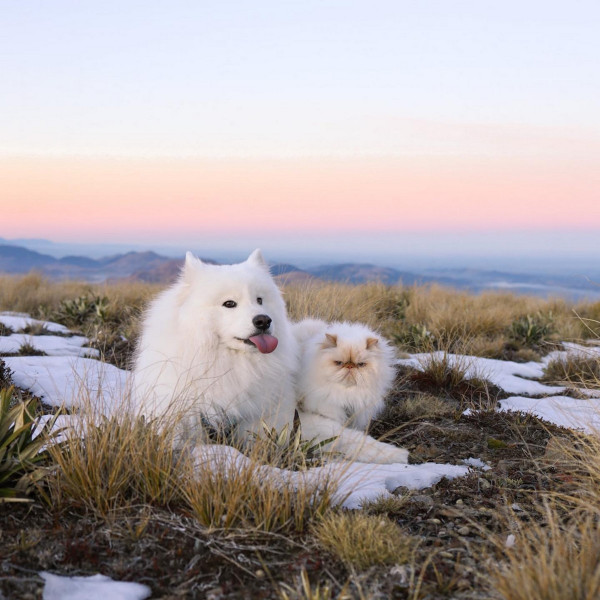 Дружелюбный пес Каспер широко улыбается, а кот Ромео хмурится. Но противоположности притягиваются, так как шестилетний улыбчивый самоед Каспер - лучший приятель хмурого двухлетнего гималайского персидского кота Ромео. Эти очаровательные пушистые друзья стали звездами социальных сетей из-за их совершенно разных выражений на мордочках и поведения. Они живут с 29-летней хозяйкой Ринсой Ли из Крайстчерча, Новая Зеландия, и вместе путешествуют по сельской местности.