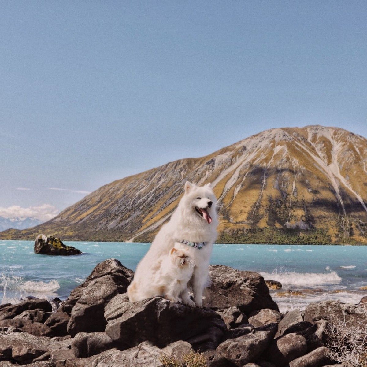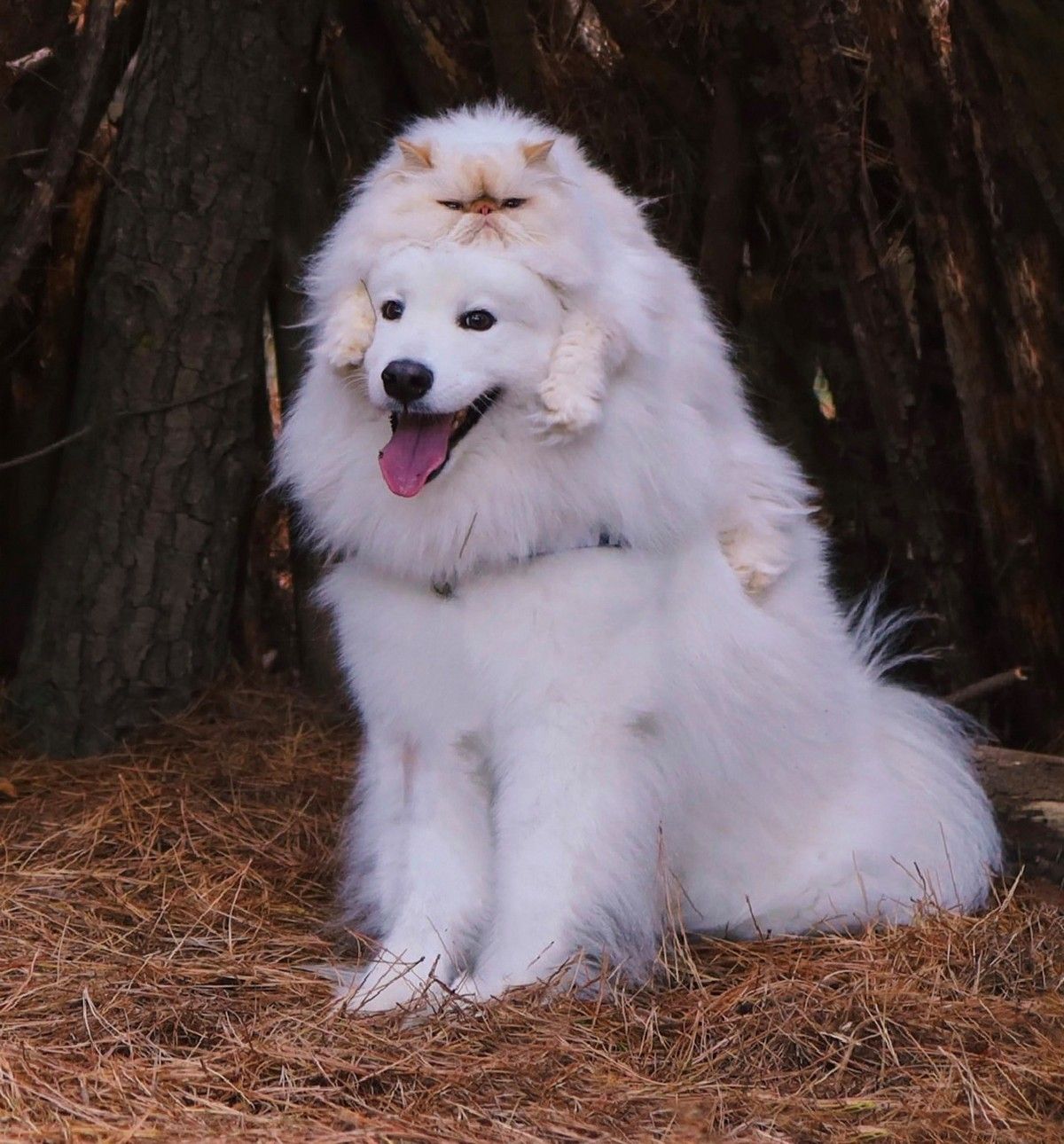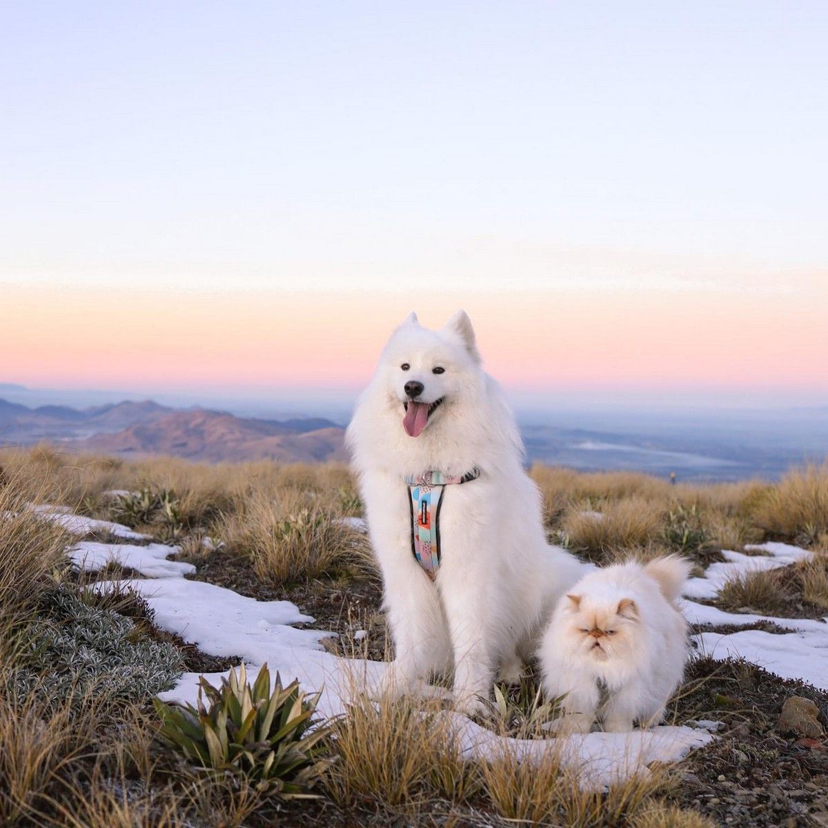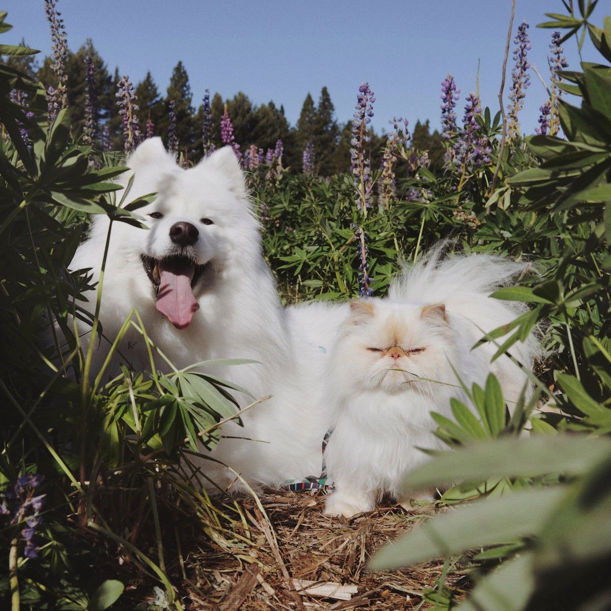 Дружелюбный пес Каспер широко улыбается, а кот Ромео хмурится. Но противоположности притягиваются, так как шестилетний улыбчивый самоед Каспер - лучший приятель хмурого двухлетнего гималайского персидского кота Ромео. Эти очаровательные пушистые друзья стали звездами социальных сетей из-за их совершенно разных выражений на мордочках и поведения. Они живут с 29-летней хозяйкой Ринсой Ли из Крайстчерча, Новая Зеландия, и вместе путешествуют по сельской местности.