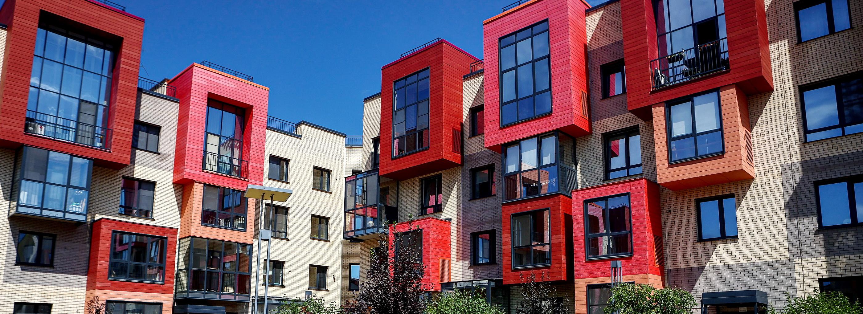 Название жилого комплекса отражено в цветовых решениях. Первые два дома оформлены в коричневых, серых и песочных оттенках, вторая очередь уже веселее — с красными и оранжевыми вставками, следующие корпуса радуют жёлтым, зелёным и синим.
