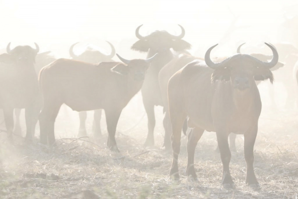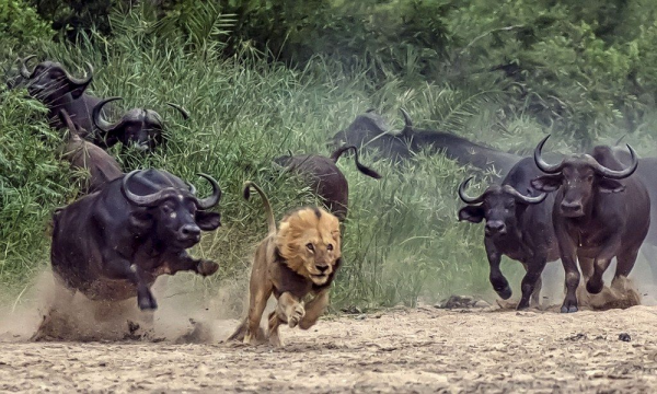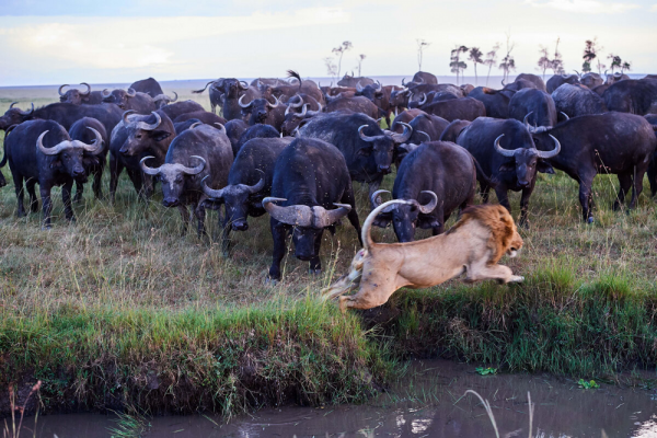 Взрослые самки и самцы ревностно охраняют молодняк и стариков. Здоровые животные пасутся на окраине, всё время проверяя обстановку. Зрение у буйволов не очень - животины больше полагаются на слух и обоняние. Единственный, кто способен покуситься на стадо, - это прайд львов. При первых признаках угрозы старейшины подают сигнал тревоги. Если бежать - не вариант, стадо собирается в кольцо: самые взрослые и опытные держат оборону вокруг телят и более слабых особей. И начинается мясо.