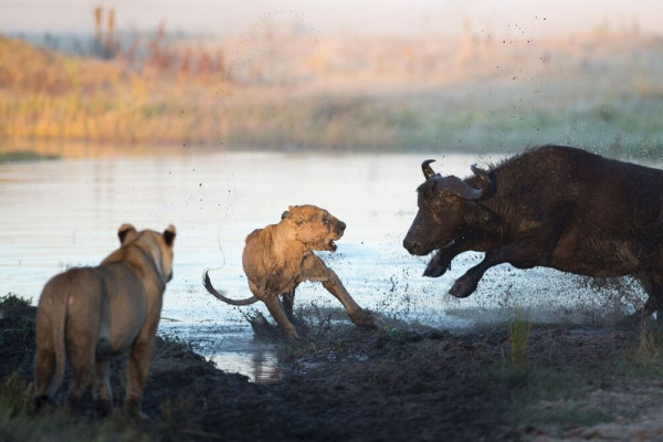 Натуралистка Евгения Тимонова описывала случай из своей поездки в Африку. На её глазах стадо буйволов напало на семью отдыхающих львов. Буйволы, как умелые охотники, разделили группу хищников. С одной стороны оказались лев и львицы, с другой - львицы и львята. Буйволы принялись за последних. Как итог: сбежать от копыт и рогов удалось лишь троим львятам из семи.Буйволы не боятся даже людей. Печальная статистика гласит, что копытные убивают человека в половине случаев атаки. То есть, если на вас бежит разъярённый бык - нотариуса вызвать уже не успеешь. Даже браконьеры - и те не рискуют идти на африканского бычка. Слишком много рисков. Да и брать с копытных нечего: массивные рога часто испорчены личинками насекомых, шкура вся в шрамах от подкожных паразитов и клещей, ну а мясо - можно и домашнюю говядину поесть.Сегодня среди большой пятёрки буйволы чувствуют себя лучше всех. И даже по сравнению с другими травоядными материка - наши герои пока что вымирать не собираются.