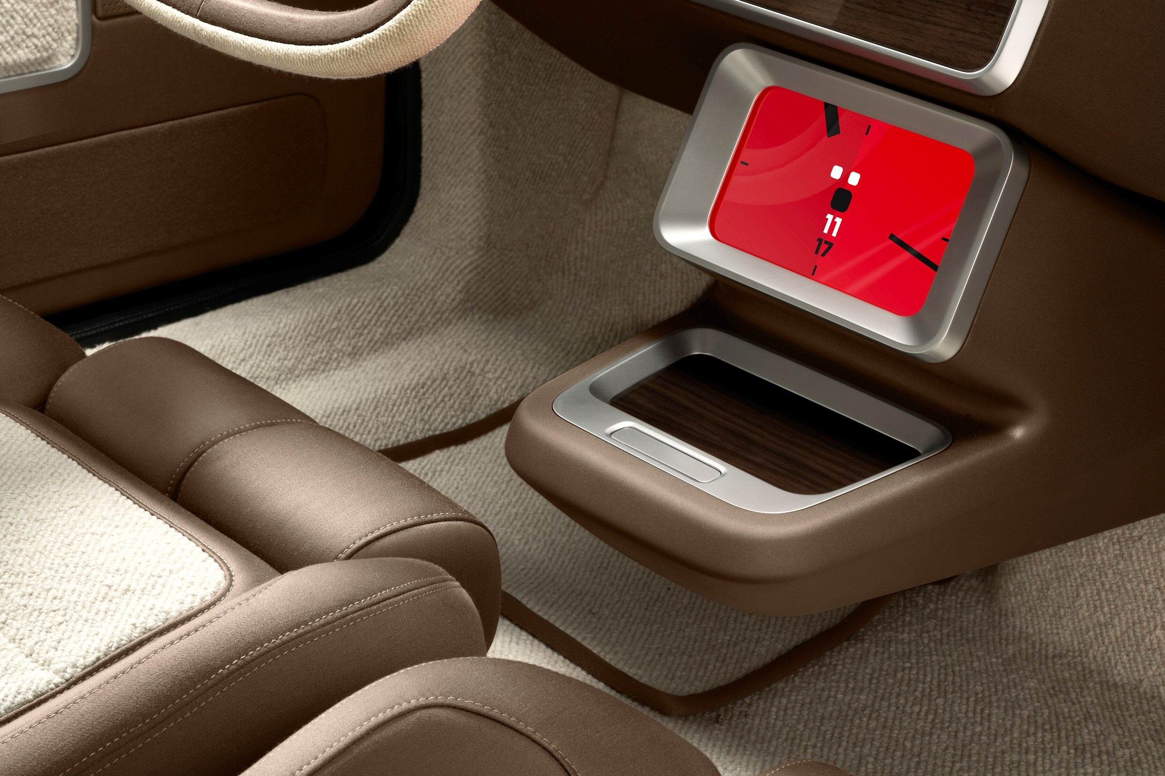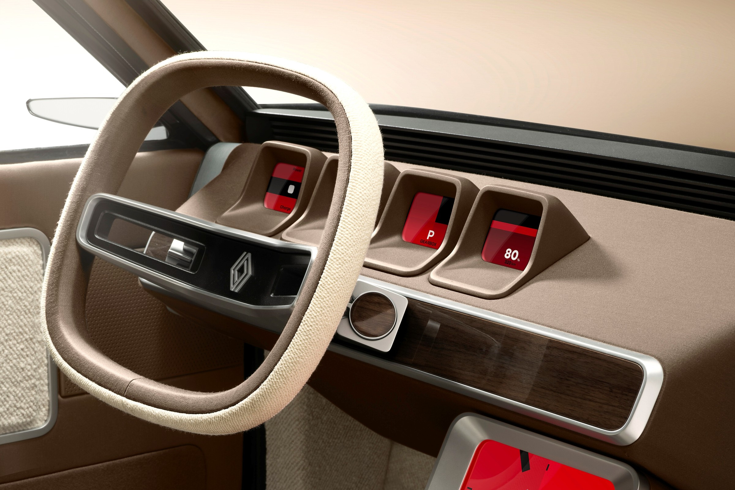 Салон рестомода сохранил принципиальную компоновку Renault 17 ранних лет выпуска (в 1976 году в ходе рестайлинга купе получило новый интерьер с высокой передней панелью) — на месте даже четыре прибора с индивидуальными козырьками, но они теперь полностью электронные, то есть представляют собой четыре маленьких экранчика. На центральной консоли, там где у оригинального купе были большие прямоугольные часы, прописался мультимедийные сенсорный экран в толстой серебристой рамке — в режиме ожидания он работает как часы и отображает циферблат со стрелками. Кресла и отделочные материалы, разумеется, полностью новые — это сочетание различных видов экологически чистого текстиля и натурального дерева. Оквадраченный руль с шерстяным ободом выглядит особенно эффектно, при этом две его дырявые спицы старательно цитируют оригинальный Renault 17.