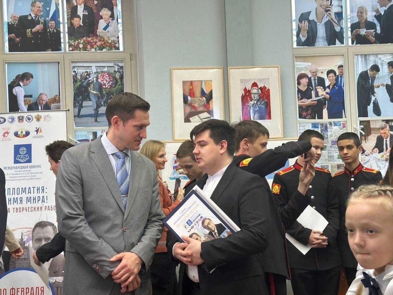 Отметим, что всемерное содействие оказали Управление делами Министерства иностранных дел, Совет молодых дипломатов МИД России и Дипломатическая академия МИД России. Для детей и их руководителей провели экскурсионную прогулку по академии. В музейном зале собрались представители дипломатических структур и участники международного конкурса. На церемонии выступили директор Департамента по многостороннему гуманитарному сотрудничеству и культурным связям А.С. Алимов, начальник отдела Департамента по многостороннему гуманитарному сотрудничеству и культурным связям (ДМГК) МИД России К.О. Колпаков, проректор по учебной работе и молодёжной политике, д-р юрид. наук А.А. Данельян, проректор по финансово-экономическим вопросам В.В. Кузнецов, председатель Сообщества жен российских дипломатов А.Д. Никанорова. А. А. Компаниец, которая является организатором международной акции, подчеркнула важность сохранения исторической памяти и уважения к героическим страницам. Основная ее цель - объединить усилия различных регионов и стран, привлечь молодежь к изучению истории, чтобы они не только знали, но и чувствовали ответственность за её сохранение. Юным художникам пожелали новых идей и творческих достижений. Подведение итогов международного конкурса «Дипломатия: во имя» приурочили к Дню дипломатического работника. Вот темы эссе, которые предлагались, - «Современная детская и молодежная дипломатия - эффективный ресурс патриотического воспитания»; «Виктор Петрович Поляничко – государственный деятель России, история и биография»; «Моя будущая профессия – Дипломат»; «Александр Горчаков — русский князь, государственный и политический деятель России, история и биография»; «Виталий Чуркин - дипломат, заслуги которого трудно переоценить»; «Мистер «Нет» - Андрей Андреевич Громыко».