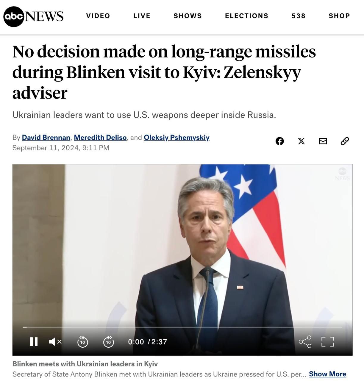 Зеленский передал Блинкену подробный план, как Украина может использовать дальнобойыне ракеты по территории РФ, и список конкретных целей, сообщает ABC News со ссылкой на советника президента.