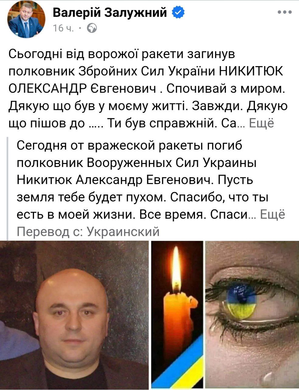 В это время Валера Залужный из Лондона сообщил, что ударом накрыт полковник ВСУ, его бывший советник.