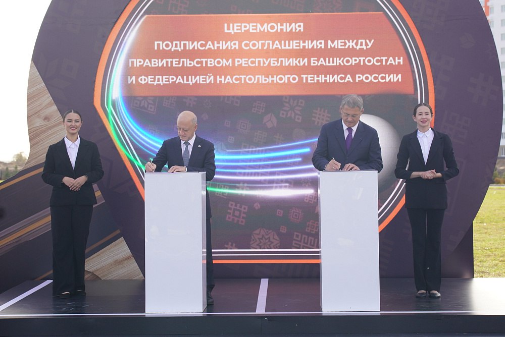 Радий Хабиров и президент Федерации настольного тенниса Росси Александр Бабаков дали старт строительства Центра настольного тенниса.